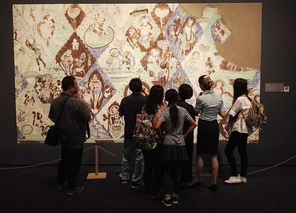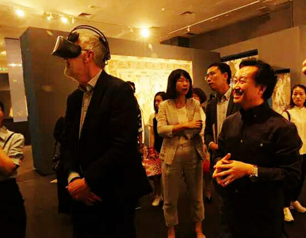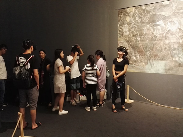 在2天的展览中,师生们运用虚拟现实技术和VR一体机,为300多位来宾带来了一场科学与艺术相融合的“龟兹佛窟和壁画”艺术视觉盛宴。来宾们饶有兴致地戴着VR一体机,津津有味地体验虚拟现实技术的科技魅力,并与师生们深入地互动交流。市重点实验室赵海英主任、郑永彪副主任来到现场看望了牺牲周末休息时间为会展服务的同学们,勉励大家发扬无私奉献的精神,做好服务保障工作。