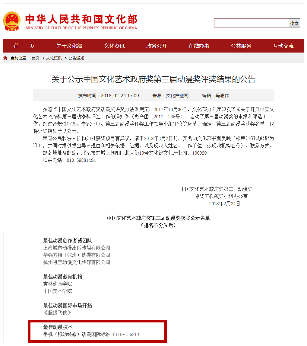 近日,学院科研与产业处处长陈洪所带领团队申报的“ITU-T.621手机(移动终端)动漫国际标准”荣获中国文化艺术政府奖第三届动漫奖“最佳动漫技术奖”。