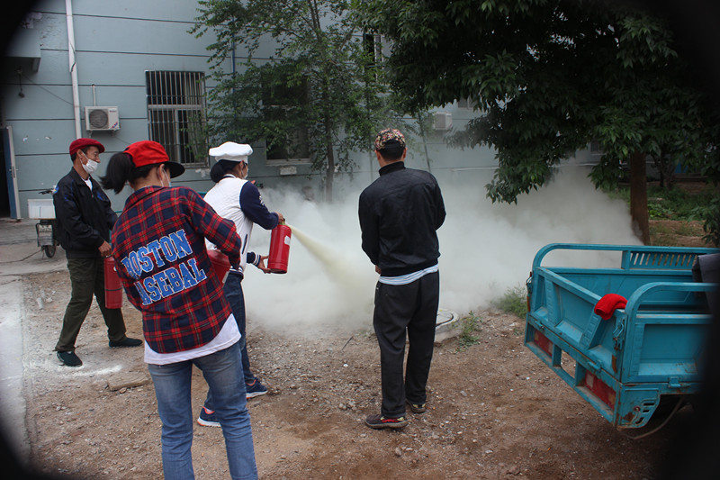 演练前,保卫处付金晶老师就疏散路线、逃生要领进行了培训。演练正式开始后,为了模拟真实场景,保卫处在食堂二、三楼后厨放置了演习专用烟雾弹。烟雾瞬间笼罩后厨,食堂安全员发出“着火啦!断电断气!快跑!”等火警信号,指挥逃生。参训人员用湿毛巾捂住口鼻、弯腰、迅速有序逃生。在极短的时间内,所有人员全部疏散到安全地带。人员集中后,保卫处李丽娟对灭火器使用步骤及要点进行了介绍。随后,演练人员分组进行灭火训练。