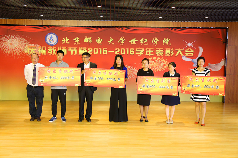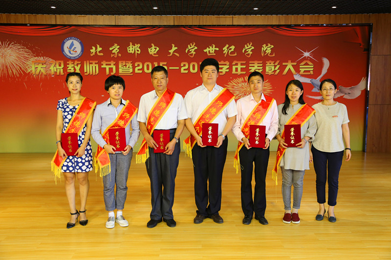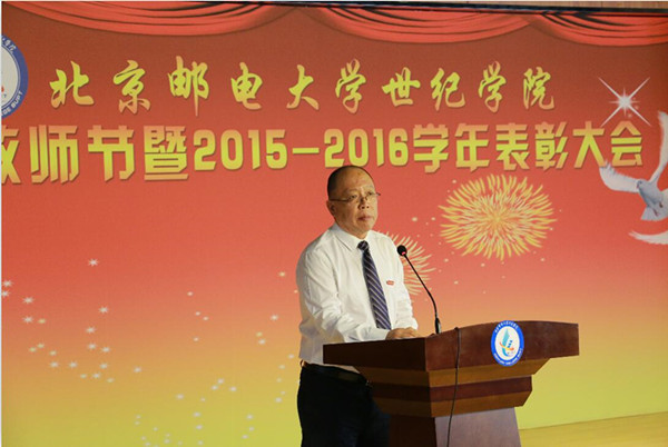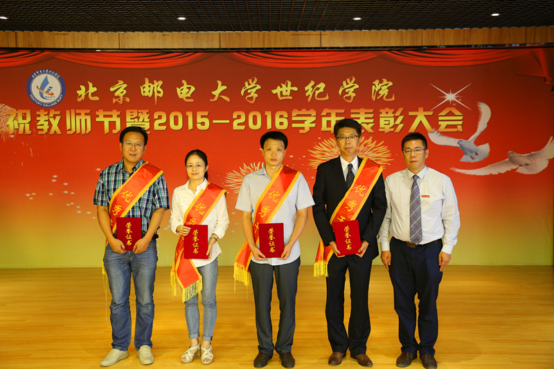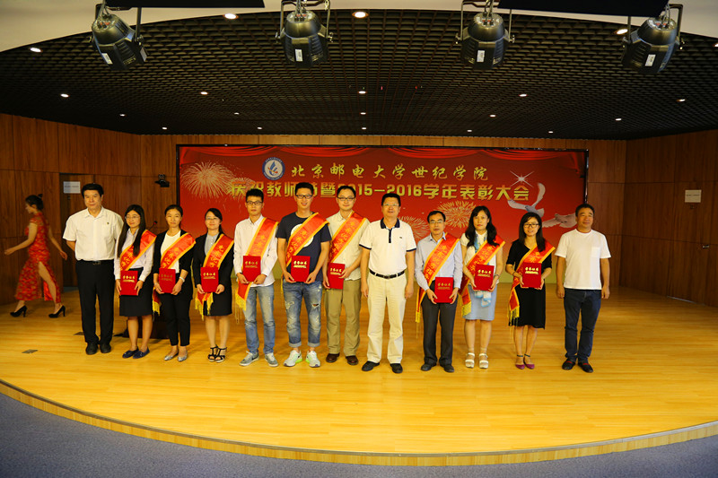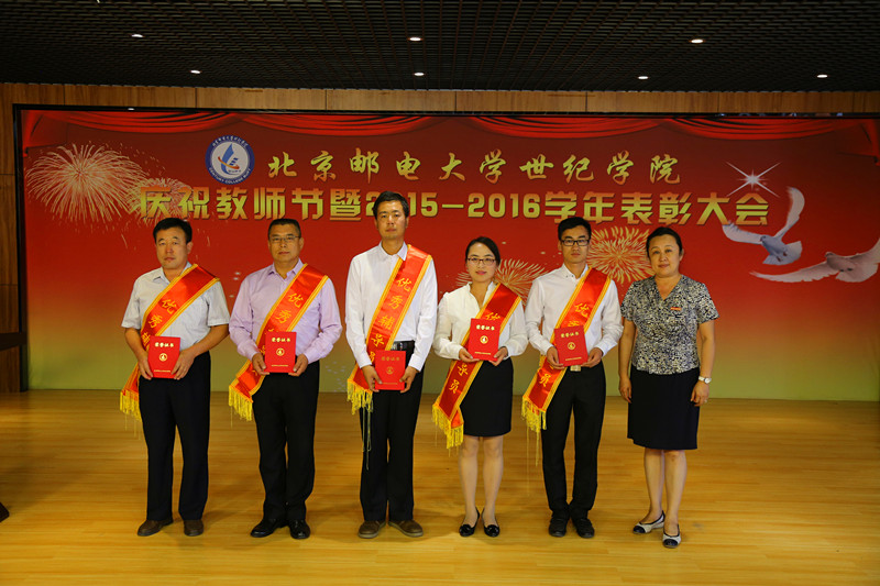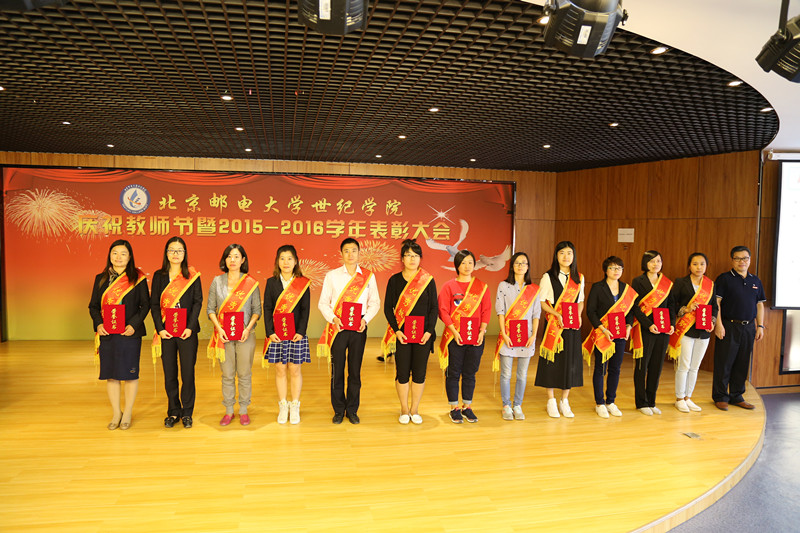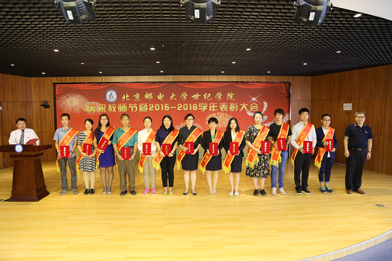 9月9日,在第32个教师节到来之际,我院隆重举行庆祝教师节暨2015-2016学年表彰大会。北京邮电大学副校长、院长李杰,学院党委书记谢苗峰,副院长李新松、孙凯、夏素霞、何晓玫及全体教职员工齐聚学思楼127教室,共庆教师们自己的节日。同时,大会特别邀请了为支持学院发展建设、为学院捐资助学的东方雨虹集团人力资源总监丁毅,浙商银行机构客户部总经理石文彬,中金天银资本管理公司董事长梁瑞峰等几位嘉宾。