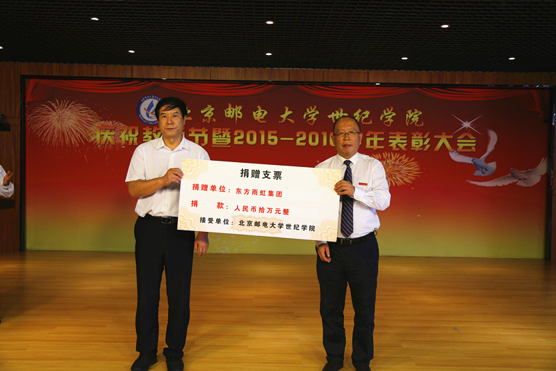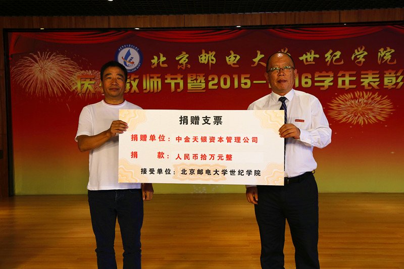 伴随着热烈的掌声,东方雨虹集团人力资源总监丁毅、中金天银资本管理公司董事长梁瑞峰分别将10万元的支票交到李杰院长的手中。东方雨虹集团现已成为亚洲最大防水系统供应商,而中金天银资本管理公司也属于国内大型投资公司。大型企业的捐资将为学院今后的发展提供助力。丁毅先生在讲话中,向全院教师送上了教师节的深深祝福,并表达了对学院未来的期盼,希望学院在各方支持与自身的发展下,培养出更多社会需要的栋梁之才。