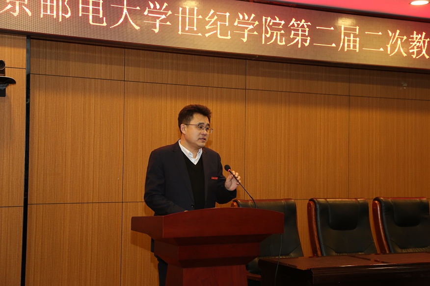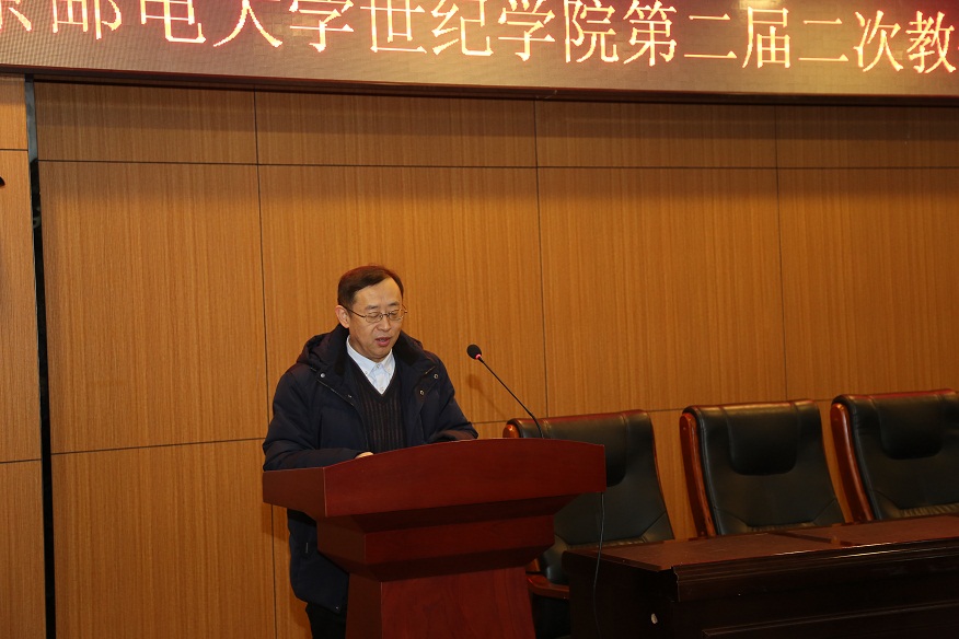 院长孙汉旭代表学院向大会作题为《新时代努力拼搏,新使命该敢为人先,为培养高水平应用型人才全面推进内涵建设》的院长工作报告。孙院长从教育教学、人才培养、队伍建设、招生就业、条件保障、党群工作等方面对2017-2018学年学院总体工作进行了总结汇报。报告分析了学院目前面临的诸多挑战,指出注重理性发展,以学生为中心、教师为主导,落实立德树人根本任务,以提高教学质量为主题,全面推进教育教学改革,进一步提升学院核心竞争力是学院发展的关键之举、必由之路。新的一年,学院工作应该在加大改革和事业发展力度的同时,继续在贴近民生、贴近群众、增加教职工归属感方面下功夫。