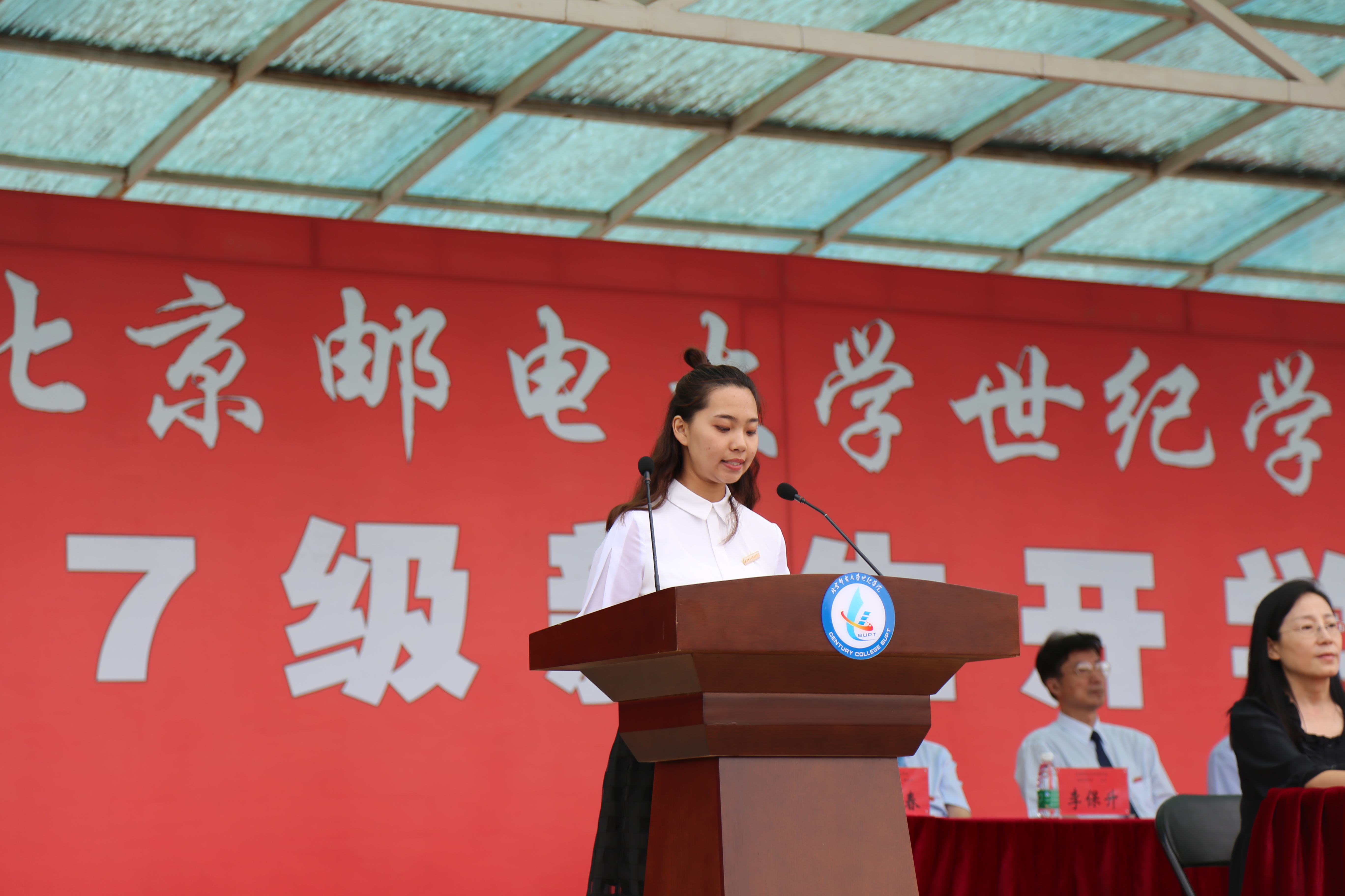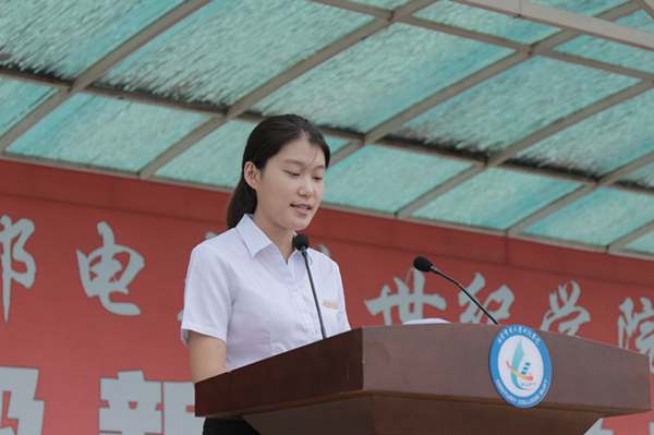 经济管理系杨菁同学和通信与信息工程系杨雨曦同学分别代表全体在校生和新生发言。杨菁同学结合自己两年的大学生活,与新生们分享了在学业、社团活动等方面的有益经验,希望大家心怀感恩、珍惜四年的青春年华。杨雨曦同学则作为一名新生呼吁同学们脚踏实地、严以律己,积极认识世纪、融入世纪,共同创造学院的崭新面貌。