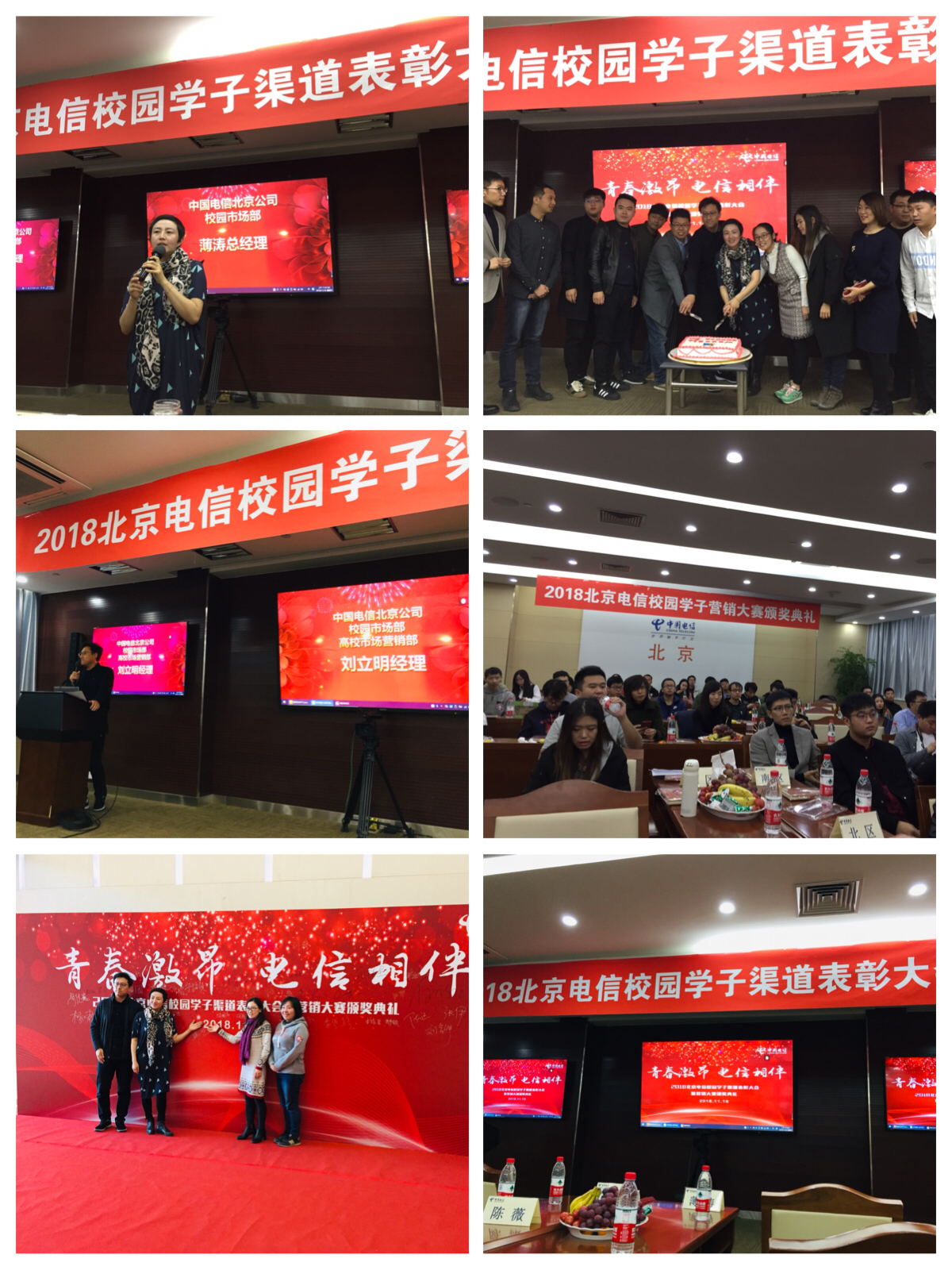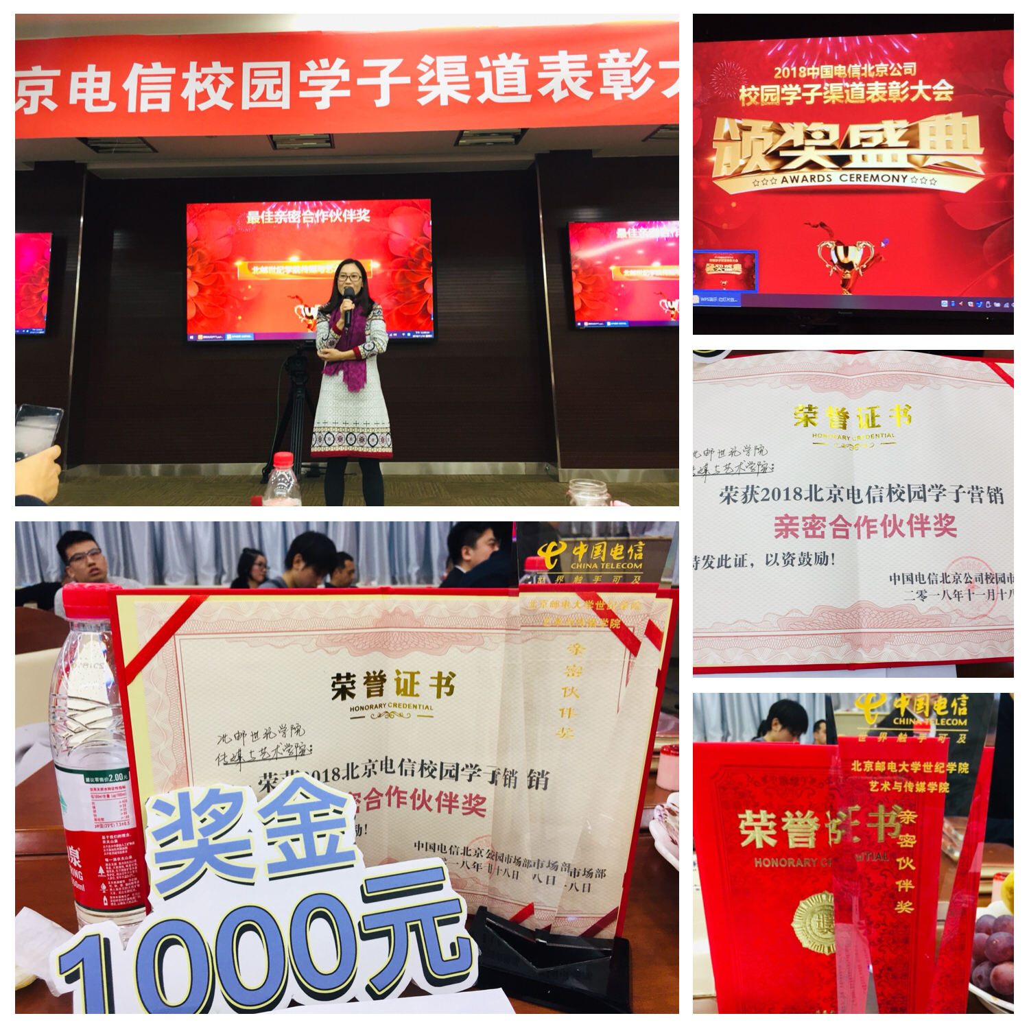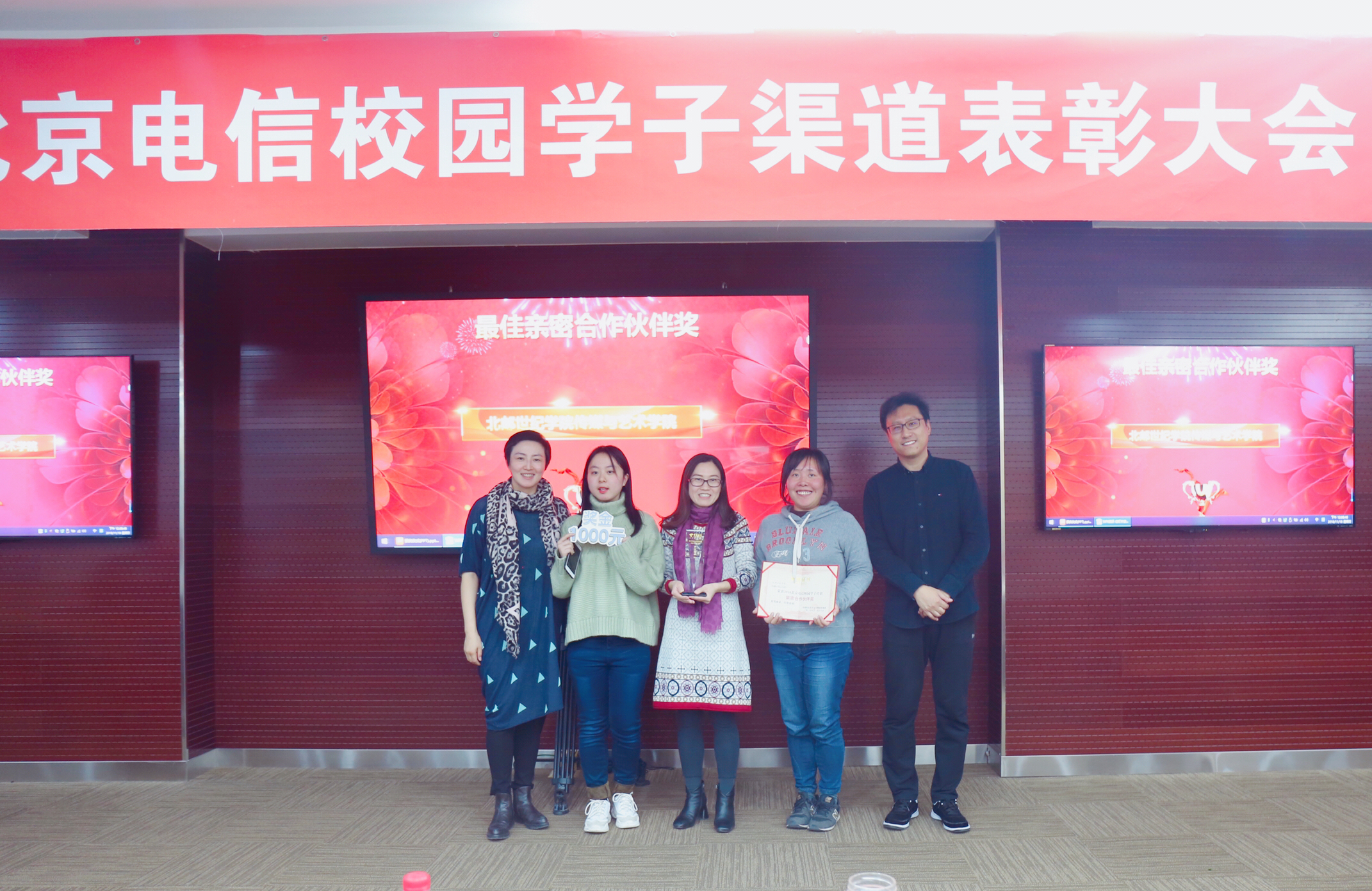11月18日上午,艺术与传媒学院副院长陈薇、传播学专业教研室主任陈迟以及学生代表受邀参加了2018北京电信校园学子渠道表彰大会暨营销大赛颁奖典礼,传媒学院获得“亲密合作伙伴”奖。北京电信校园市场部薄涛总经理、高校市场部刘立明经理、校园市场部高校市场营销部赵鲍飞经理、各分公司渠道经理等出席活动。