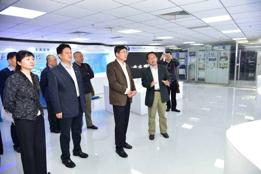 会前,乔校长陪同张旭副部长一行参观了北邮信息光子学与光通信国家重点实验室、网络与交换技术国家重点实验室。