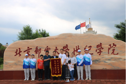 5月26日,阴雨绵绵,来自通州的一家人将一面写有“爱心托起希望,真情传播万里”的锦旗,专程送到了北京邮电大学世纪学院,以表达对我院世园会志愿者团队的感谢。