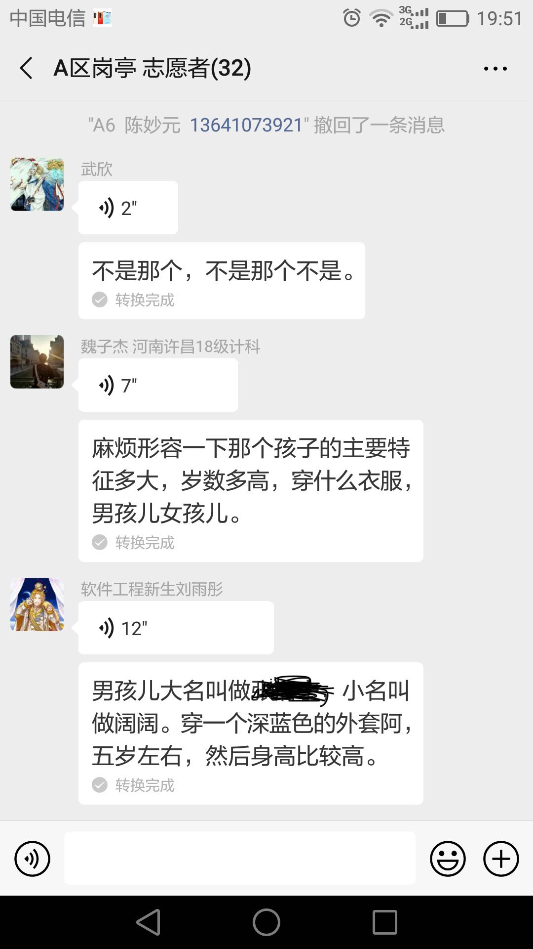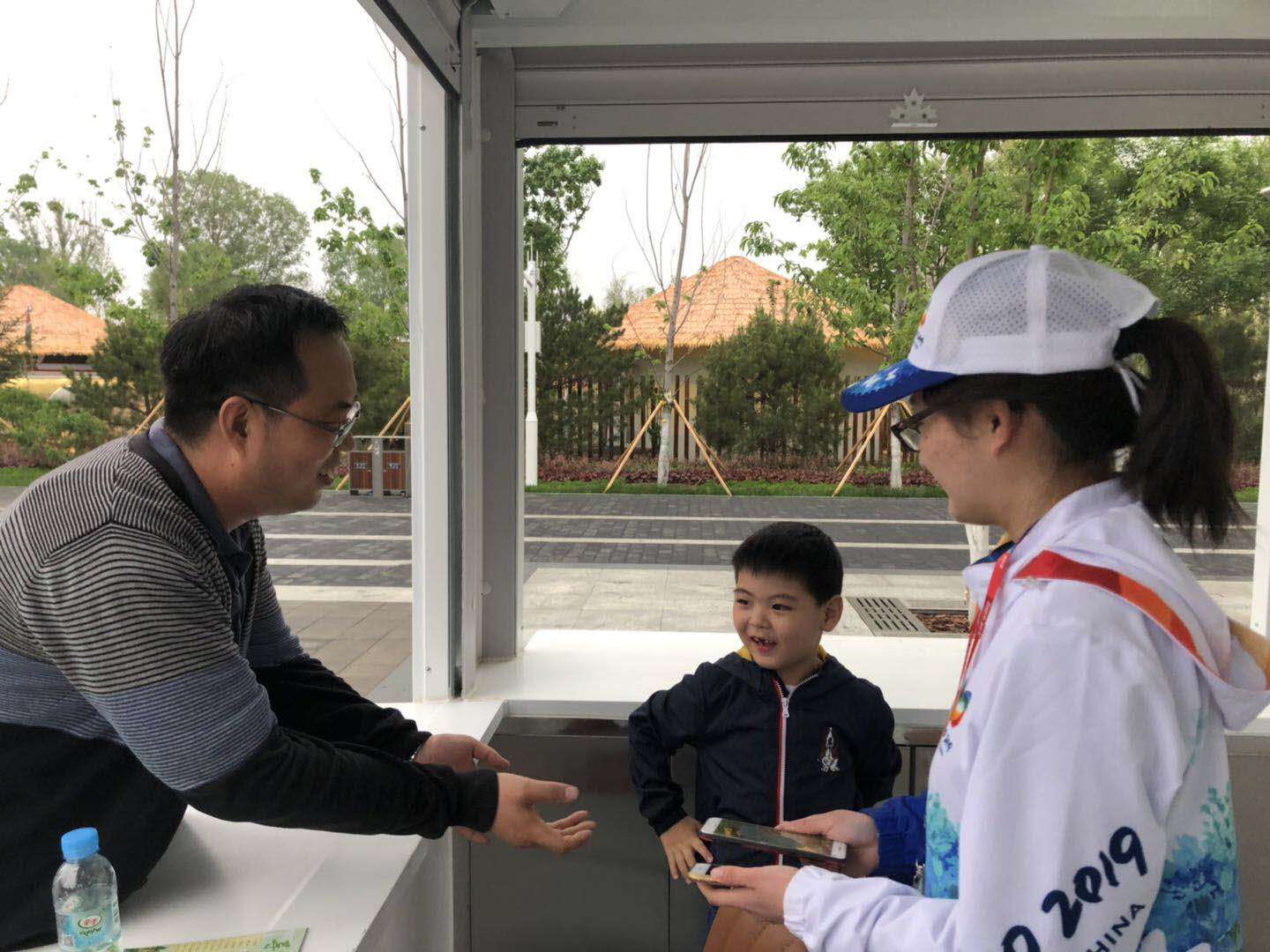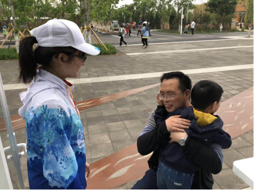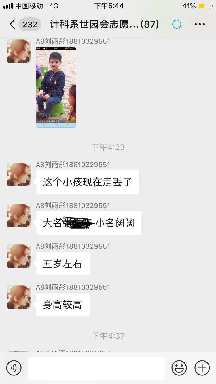 5月18日,世园会迎来了十万游客。下午14时左右,一名游客来到A5志愿者岗亭,称自己5岁的儿子阔阔在中国馆附近走失,希望志愿者能够帮忙寻找。之后,志愿者联系游客服务中心,通过广播播报寻人启示。同时,通过对讲机、志愿者微信群发布寻人信息。带队老师得知情况后,在不影响岗亭志愿服务的情况下,抽调部分志愿者园内进行寻找。各个岗亭在志愿服务过程中,询问游客是否见到照片中的孩子,如见到第一时间和志愿者联系。16:30分左右,在C7志愿者岗亭卢熠和赵雪彤等志愿者在服务过程中得知走失儿童在生活体验馆附近,在游客和志愿者的帮助下将走失儿童安全接至C7志愿者岗亭,并第一时间通知父母前来认领。至此,走失近三个小时的小阔阔终于和爸爸妈妈团聚了。