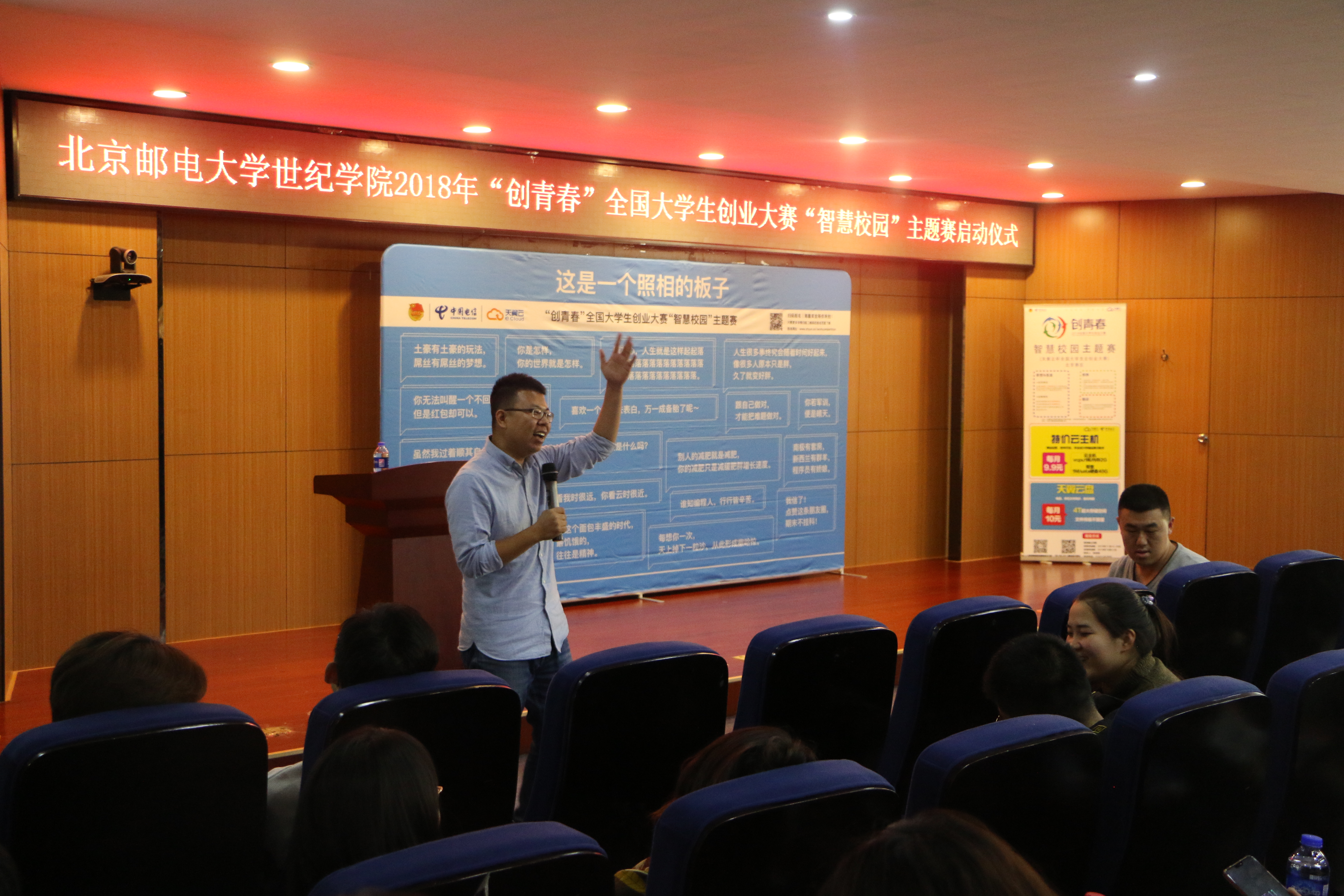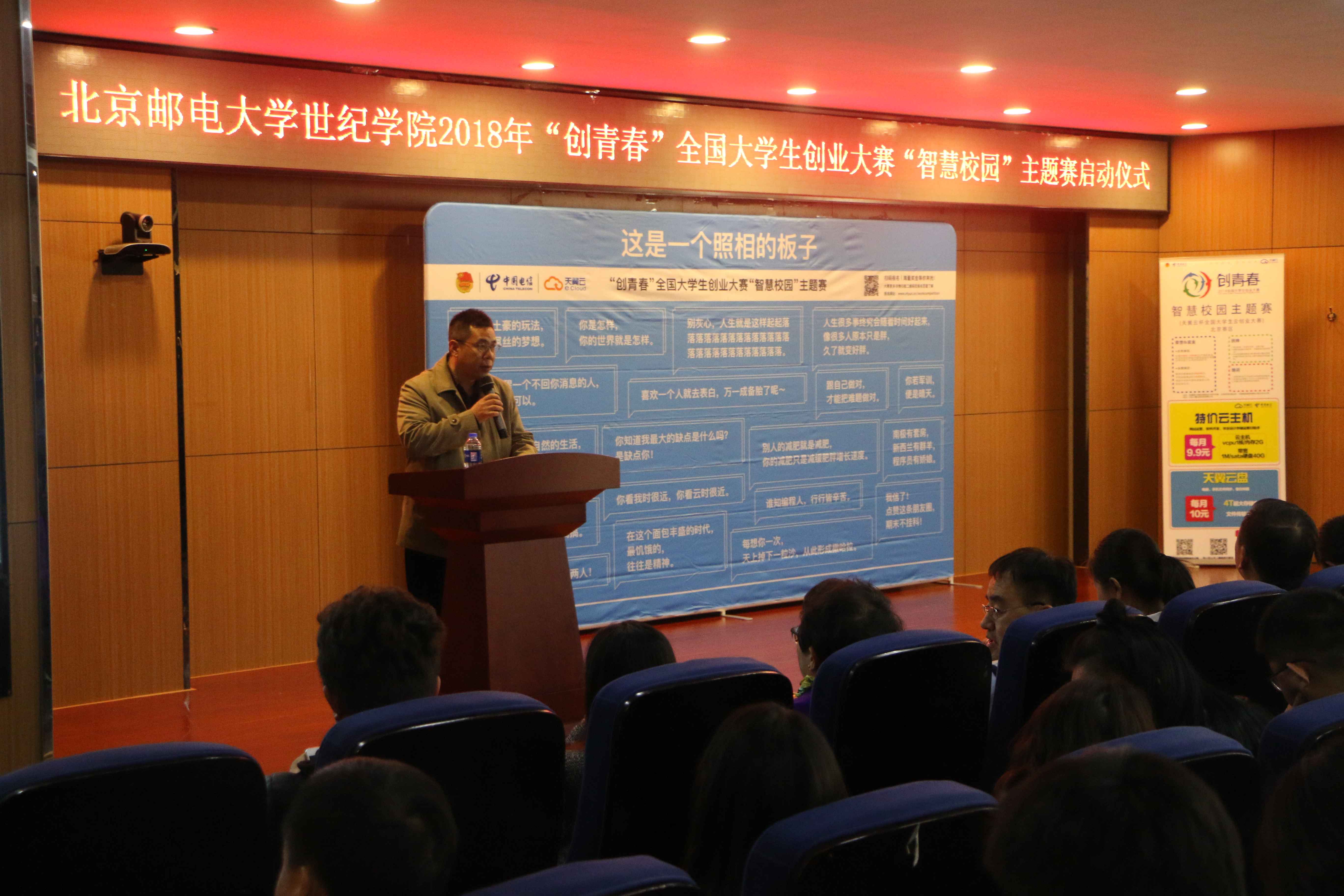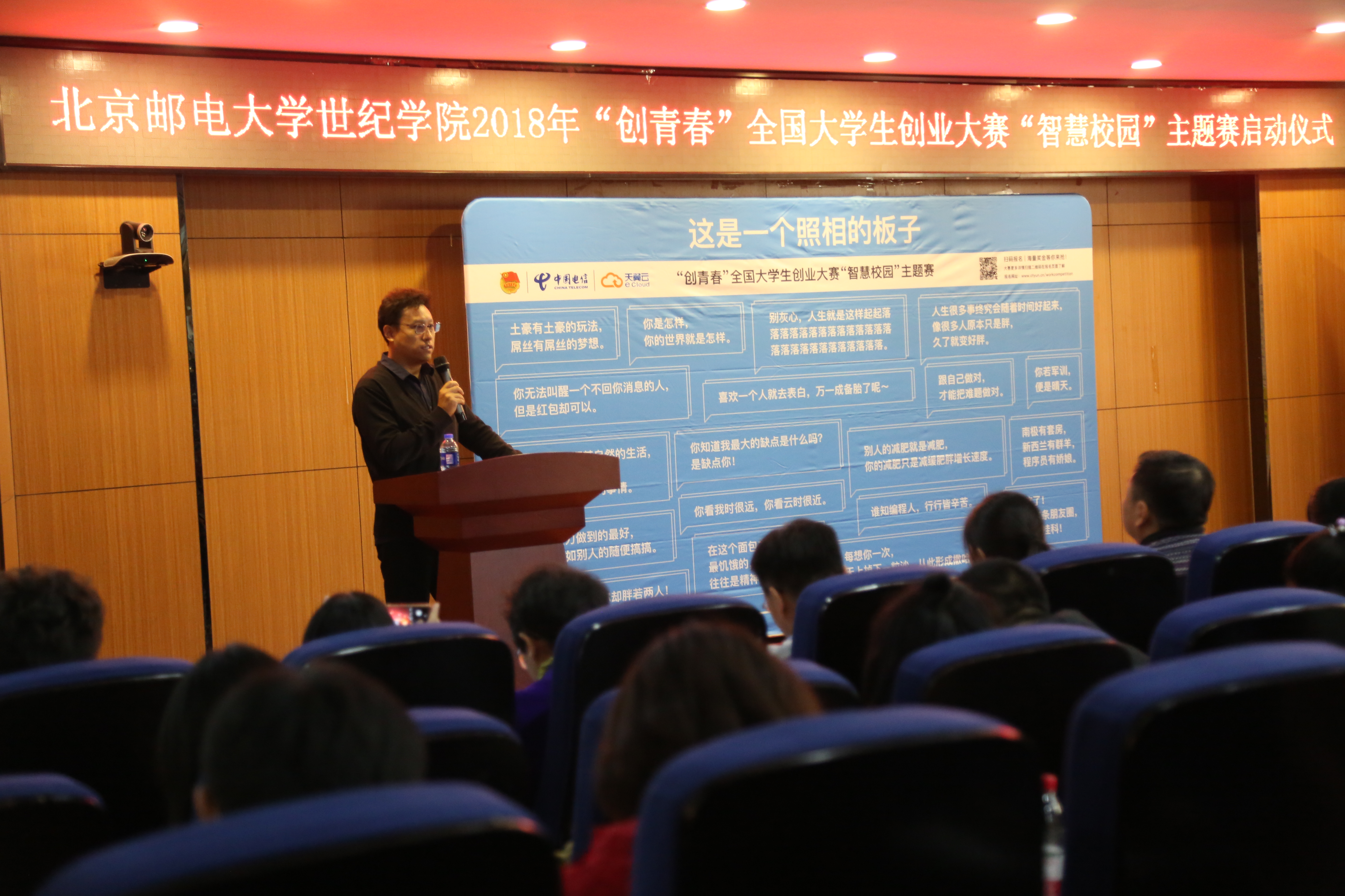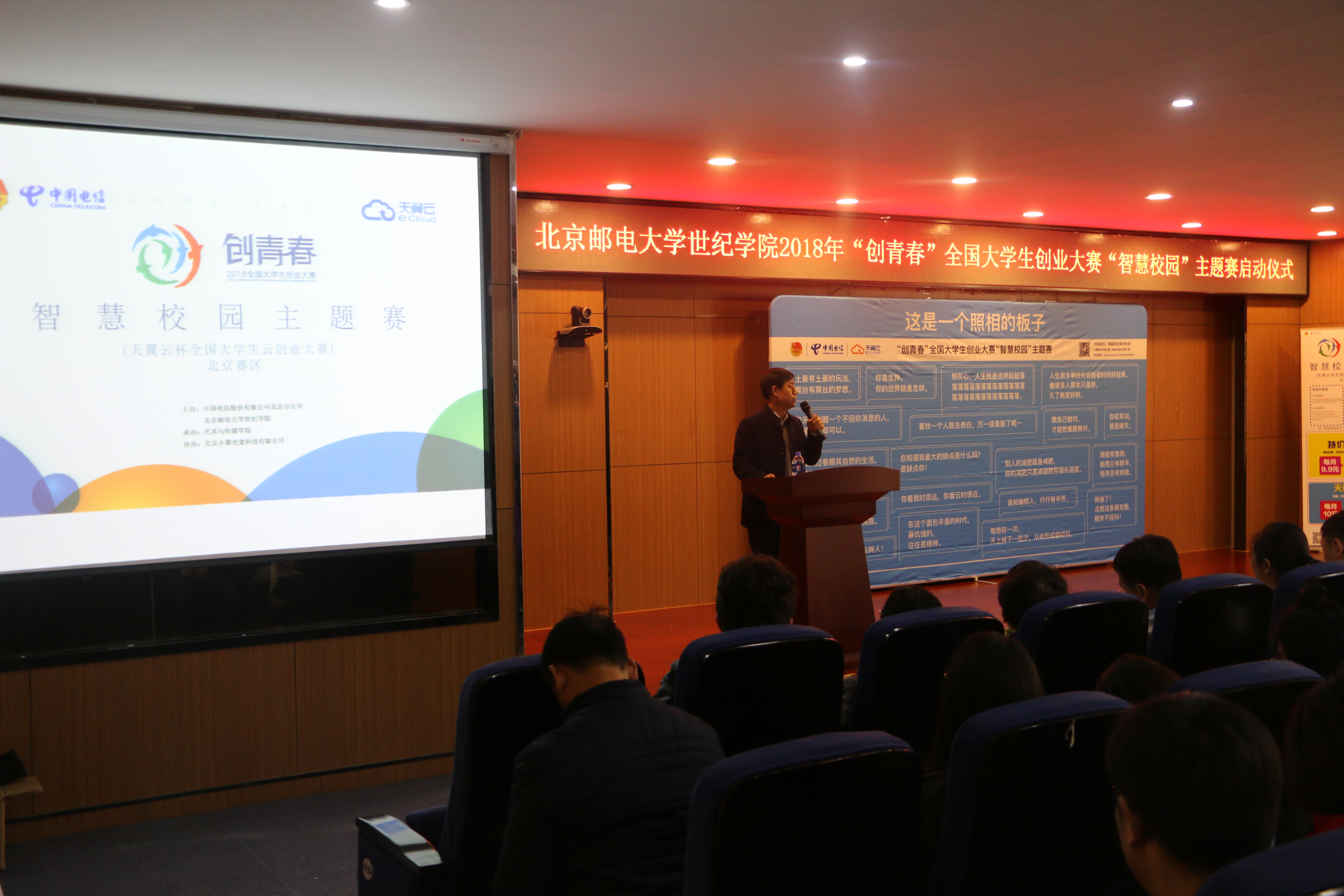 近日,为响应国家、团中央的号召,学院组织参与2018年“创青春”全国大学生创业大赛“智慧校园”创业大赛,暨中国电信“天翼云杯”全国大学生云创业大赛。为了更好的动员、宣传大赛,10月24日14:30,学院联合中国电信股份有限公司北京分公司,在学思楼229共同举办学院2018年“创青春”全国大学生创业大赛“智慧校园”主题赛启动会。本次启动大会邀请了北京电信校园市场部高校市场营销部总经理刘立明、北京电信延庆电信局营销经理孟文众、北京电信校园市场部高校市场营销部经理赵鲍飞及北京电信校园市场部高校市场营销部学子渠道经理刘洪波。党委书记谢苗峰,教务处副处长兼创新创业教育中心主任张长江及各教学单位负责人参加了启动会。