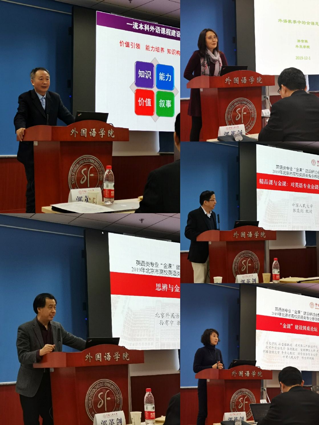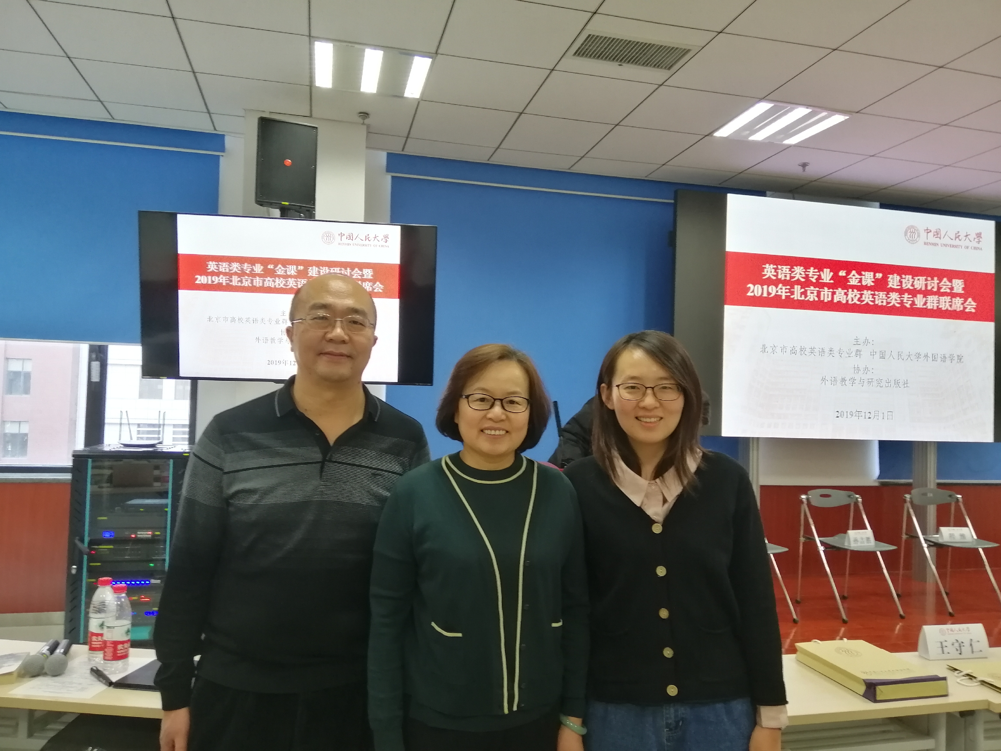 优质课程建设是高校教学质量保障和教学改革的重要路径。教育部高等教育司司长吴岩在“中国大学教学论坛”上明确指出,高校应当建设高阶性、创新性和有挑战度的“金课”,淘汰“水课”。2019年12月1日,由北京市高校英语类专业群、中国人民大学外国语学院主办,外语教学与研究出版社协办的英语类专业“金课”建设研讨会暨2019年北京市高校英语类专业群联席会在中国人民大学明德国际楼外国语学院310讲堂成功举办。我院外语系主任秦罡引、英语专业教研室主任王佩玉以及骨干教师杨坡受邀参加会议。