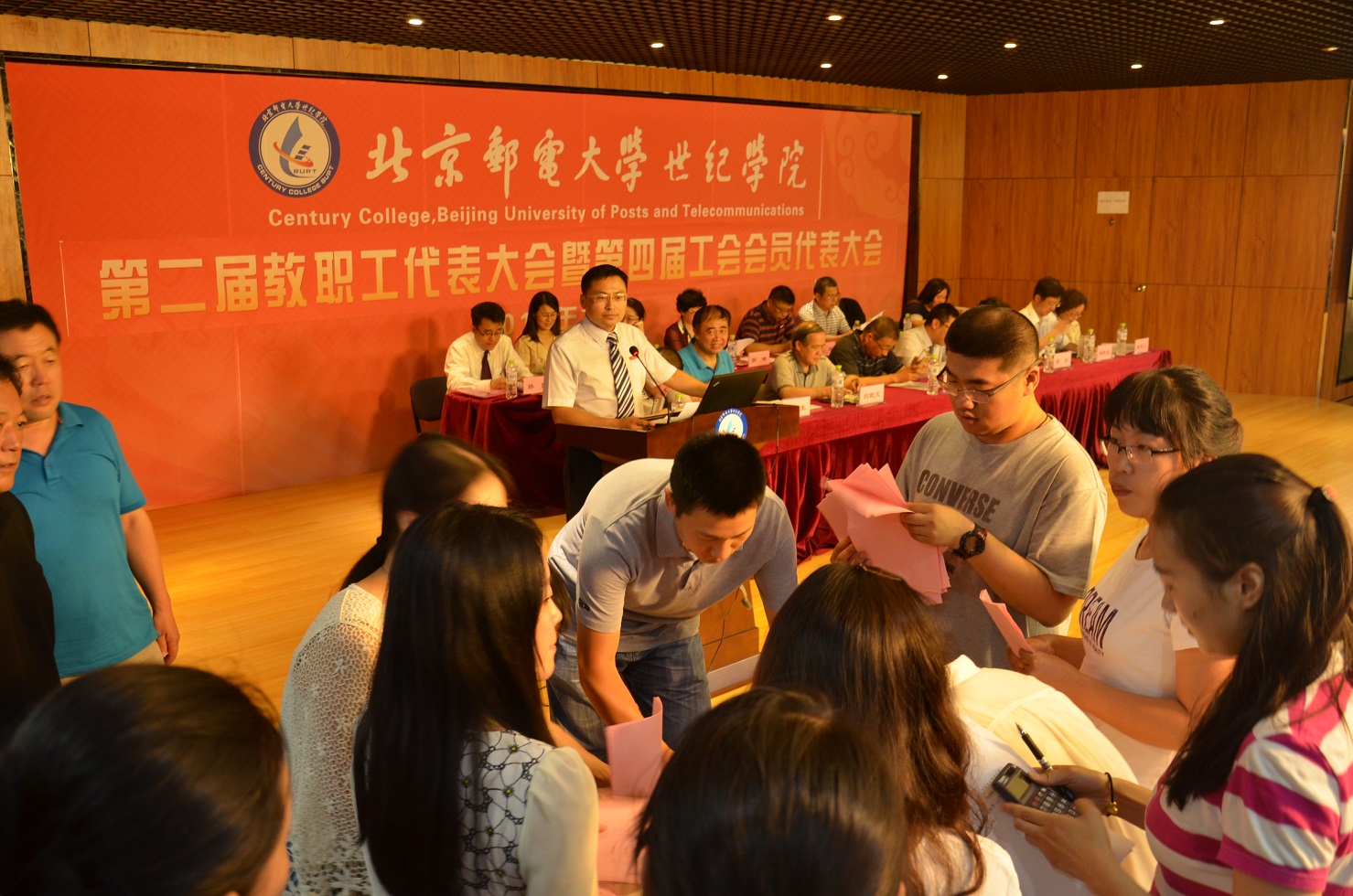 7日下午,大会闭幕式上,北京邮电大学工会常务副主席王翔亲临会场,并就加强基层工会组织建设、教代会制度建设和教职工服务体系建设,依法依规开展工会工作,维护教职工合法权益等方面进行了系统解读,希望世纪学院工会在今后工作中,继续围绕中心工作,服务大局,取得更好的成绩。