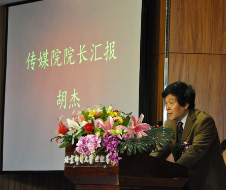 传媒学院胡杰院长向大会做工作汇报,他从7个方面介绍了传媒学院在10年发展中形成的育人特色和取得的成绩。