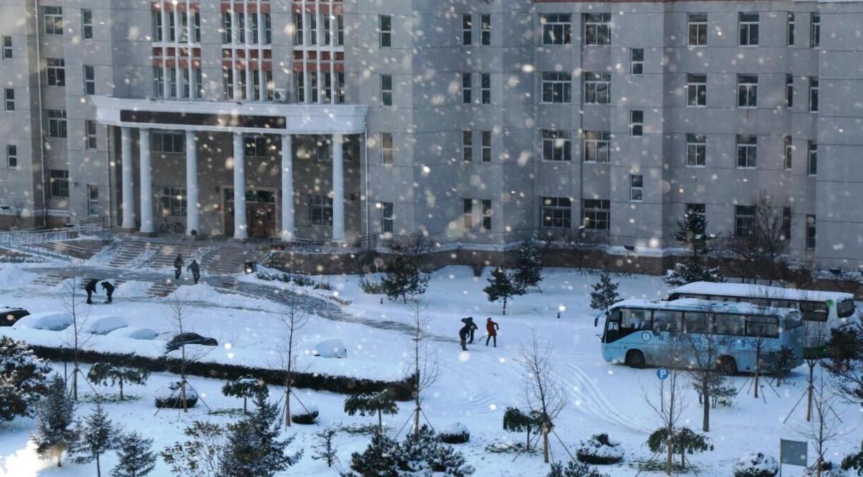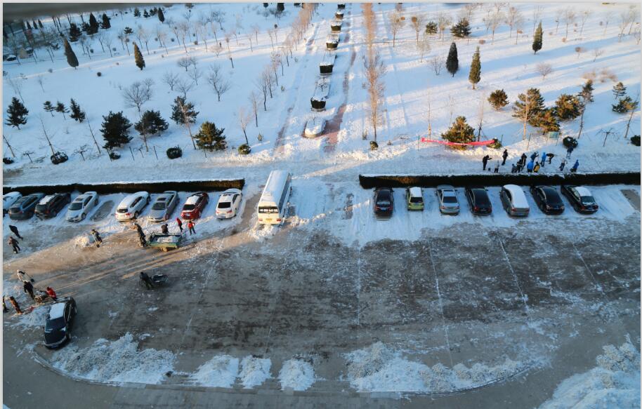 25日上午,延庆大风降温,积雪未融,又添“新冰”。后勤处再次号召铲雪铲冰,各机关单位负责明德楼前。老师们带上手套抄起铁锹,顶着寒风破冰开路,一个小时后,明德楼广场又露出一片空地。无奈大风夹雪肆意呼号,只得暂时收兵。