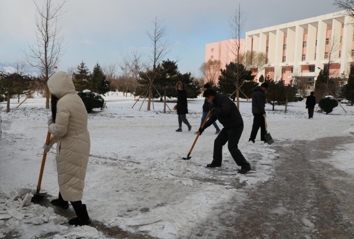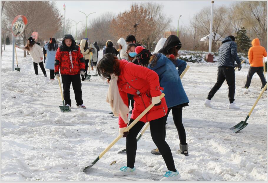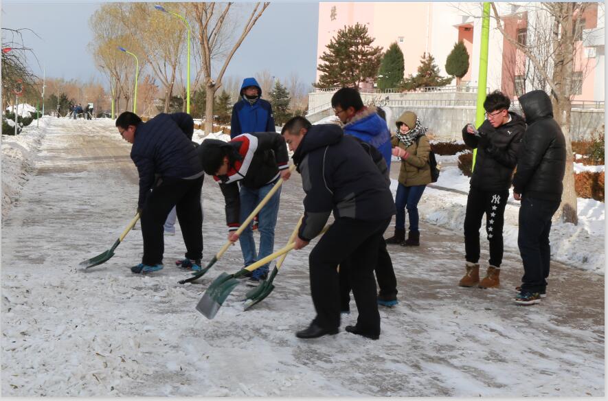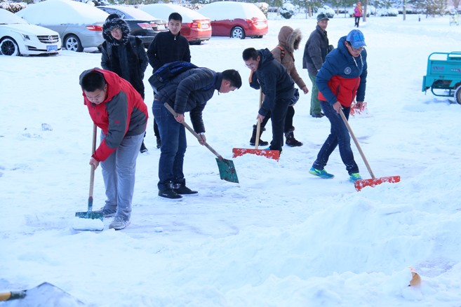 校园是我们共同的家,扫雪铲冰齐上阵更是人人为我我为人人的义举。从院领导到教职工,从老师们到同学们,在这场持续降雪降温天气面前,我们用超强的凝聚力和责任心以实际行动给这个寒冬一点颜色看,让我们在享受冬雪带来的欢乐的同时,谨慎出行,主动担当。(校通社记者陈丹供稿)