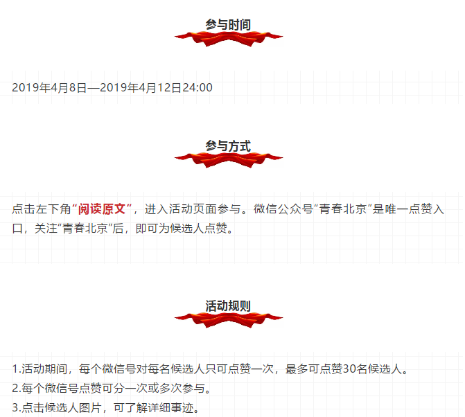 王禹勋本次入选“第三十三届北京青年五四奖章”评选,请我校师生为其投上宝贵的一票,投票方法:关注“青春北京”微信公众号,即可为候选人【1号王禹勋】投票。