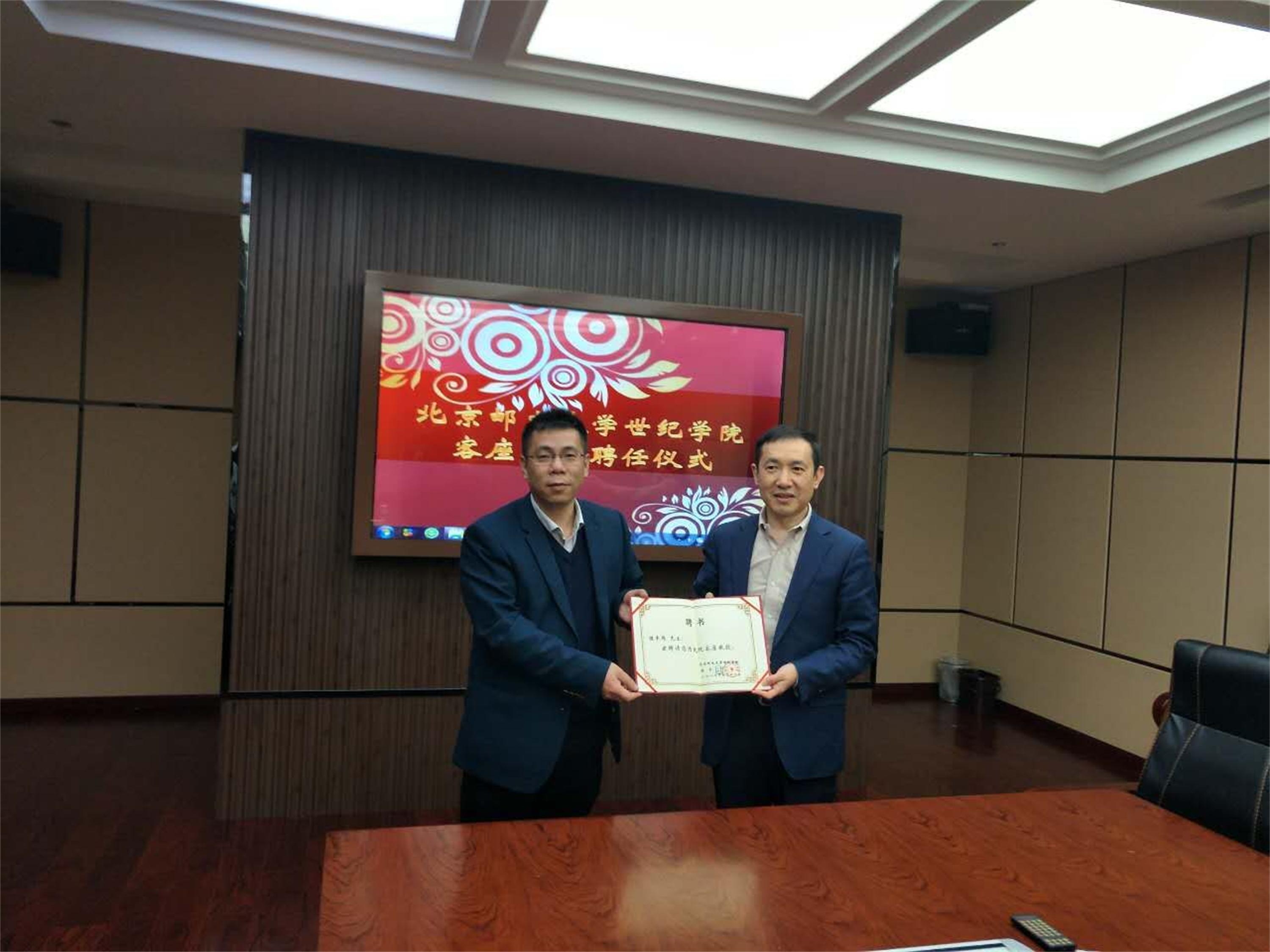 4月12日下午,学院举行客座教授聘任仪式,正式聘任中国联通实体渠道部副总经理陈丰伟、通信行业资深专家左风为我院客座教授。运营商世界网总裁康钊,运营商世界网副总裁康锐,学院党委书记谢苗峰、副院长夏素霞、科研处处长陈洪、教务处副处长兼创新创业教育中心主任张长江、计科系主任助理张敏杰等出席了聘任仪式。