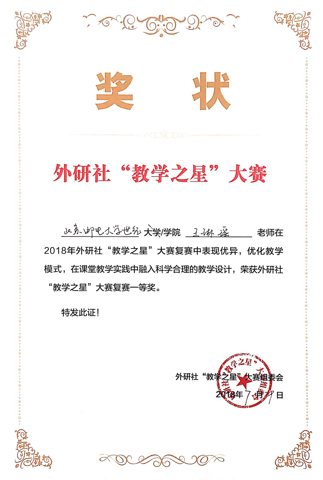 7月27-31日,在2018年外研社全国高等学校英语专业教学发展与创新研修班暨“教学之星”大赛(英语专业组)中,外语系青年教师王琳瑶凭借扎实的专业功底与出众的教学能力,获得复赛一等奖。