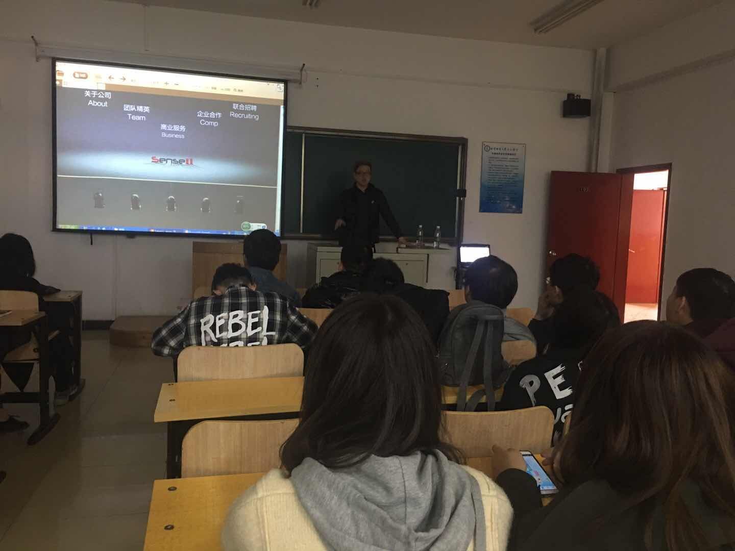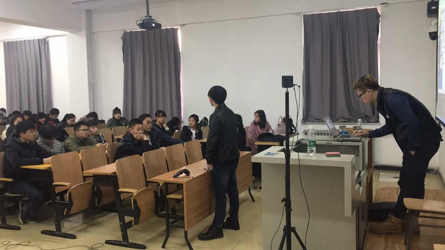 讲座前,姜海老师邀请学生们体验了VR展示,亲身感受虚拟与现实相结合的神奇之处。之后,他围绕VR 以及CGl技术在广告、影片制作中的应用,为学生们讲解了从建模、镜头设计,到最后预演、组装、渲染、交片等一系列制作过程。通过观看Sense 11studio 视效案例,同学们切身体会到了CGl技术渲染出的影片所具有的真实性。