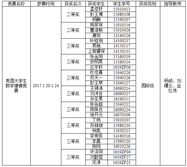 近日,2017年美国大学生数学建模竞赛与交叉学科数学建模竞赛(MCM/ICM)成绩揭晓,我院有2支队伍荣获国际二等奖(Honorable Mention),他们是由通信与信息工程系2015级通信工程专业的孟佳轩、2015级电子信息工程专业的彭玉博和电子与自动化系2015级机械电子工程专业的杨鹏组成的参赛队伍,以及由通信与信息工程系2015级通信工程专业的陈家琛、曹淑敏和外语系2013级英语专业唐恬组成的参赛队伍。学院其余8支参赛队伍获国际三等奖(Successful Participant).