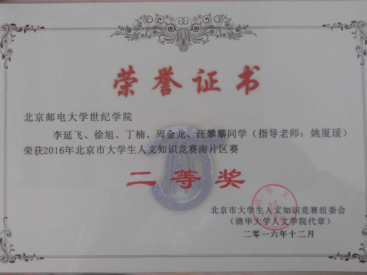 近日,在第八届北京市人文知识竞赛中,我院代表队获得南片赛区二等奖。