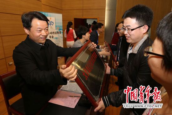 4月14日,2015年KAB创业教育年会在四川大学召开。团中央书记处书记傅振邦为获得KAB创业教育基地的学校授牌。本报记者 李建泉/摄