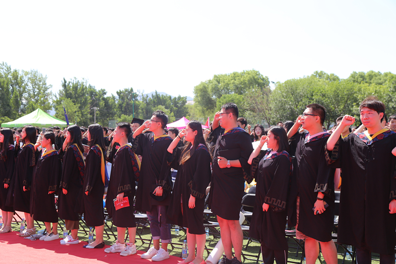 为进一步增强毕业生的社会责任感和历史使命感,在经济管理系毕业生房伟琪同学的领誓下,全体毕业生面向国旗、院旗,用高亢嘹亮的声音立下了“铭记师长教诲、弘扬世纪精神,崇尚奉献、追求卓越,明德砺志、笃学致用,回报社会、服务人民,肩负起时代赋予的神圣使命, 为祖国富强不辞劳苦,为民族复兴奋斗终生”的神圣誓言。