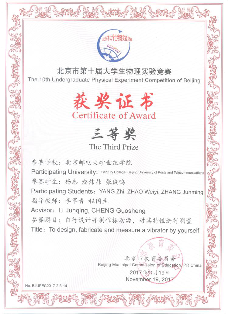 近日,在第十届北京市大学生物理实验竞赛中,我院俞婷等同学完成的“液体折射率自动测量仪”、韩晓月等同学完成的“利用电容器的原理搭建实验装置,测量某些物理参数”、杨志等同学完成的“自行设计并制作振动源,对其特性机型测量”项目均获得了三等奖。