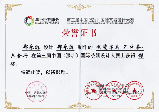 同时,郑永彪副教授设计的作品屡获大奖:在2018年7月举办的第三届中国(深圳)国际茶器设计大赛中,《六合兴》茶具荣获银奖,《初心》茶具荣获铜奖。《初心》茶具还被浙江省嘉兴南湖红船纪念馆、西伯坡纪念馆、遵义会议纪念馆、焦裕禄纪念馆、习仲勋视察长葛纪念馆、杨水才纪念馆等红色基地收藏。《永旺直前快客杯》荣获“魅力许昌”文创大赛最高奖——2017-2018年度城市礼品,并被清华大学经管学院遴选为院庆纪念品。2019年1月,《葛天乐舞(又名歌舞升平)》茶具在第24届“河南之星”设计艺术大赛上荣获铜奖,郑永彪副教授被授予“最佳设计师奖”。《师魂》漂洋过海,被留学哈佛大学的博士生作为毕业礼赠送哈佛大学教授,被北师大文学院选为礼品赠送给退休教师,深受好评。