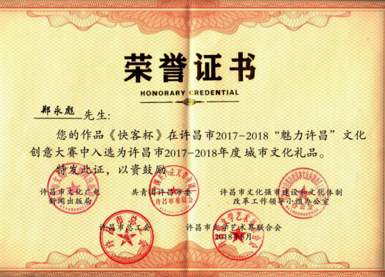 教学之余,郑永彪副教授也非常关注地方经济社会的发展。他于2016年提出北京世园会“瓷说花语”创意项目,并和朱颖博老师合作的“瓷说花语”系列中国传统花卉釉下五彩花瓶,得到了组委会的高度赞赏和肯定,将在延庆馆展出。同时,郑永彪副教授也非常关注故乡文创的发展,受邀为许昌市免费设计了曹魏古城标志,为禹州市设计了市标,为曹魏古城和神垕老街营销出谋划策,得到了当地政府和人民群众的广泛好评,被许昌市委和市政府评选为许昌英才。