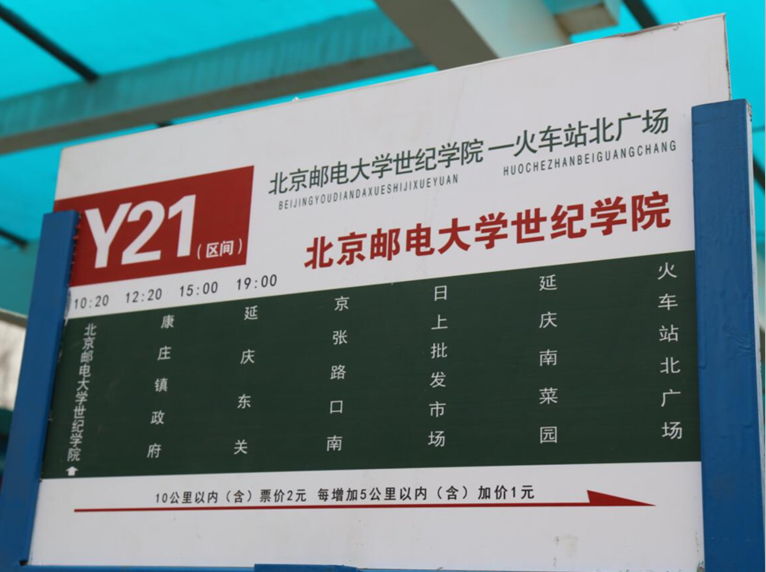 3月4日,延庆Y21路(北京邮电大学世纪学院←→延庆火车站)区间定点公交正式通车,通车仪式在北京邮电大学世纪学院校门口举行。该车次是继880路区间和919路周末学生专线后,延庆交通局为解决师生出行难问题特别开通的又一班次,发车时刻极度贴合师生上下课时间。该路公交车从学院北门始发,到达延庆城区只需要20分钟,转乘919路公交、S2线小火车更加便捷,也为延庆康庄地区居民出行提供了极大的便利。