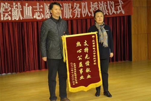 随后,延庆教委副书记王秦生郑重向无偿献血志愿服务队授旗。延庆卫计委主任尹文强在致辞中感谢学院多年来对献血活动的支持,希望更多的人关注并参与到无偿献血活动中来。