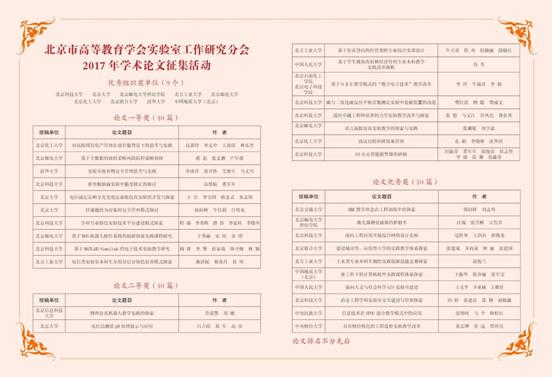 本次论文征集活动于2017年秋季学期完成,征文活动得到了学院教师们的积极响应,所有投稿论文已全部收入《北京高等教育学会实验室工作研究分会2017年度学术年会论文集》。作为实验室工作研究会的理事单位,学院一直以来积极参与相关活动,并通过研究会平台不断与其他高校开展交流学习。