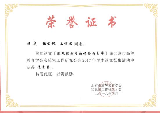 近日,在北京高等教育学会实验室工作研究分会2017年度学术研讨会征文评选活动中,学院汪成、张雪枫、豆竹君3位教师撰写的《激光器测量液体的折射率》获得论文优秀奖,学院获得优秀组织奖。