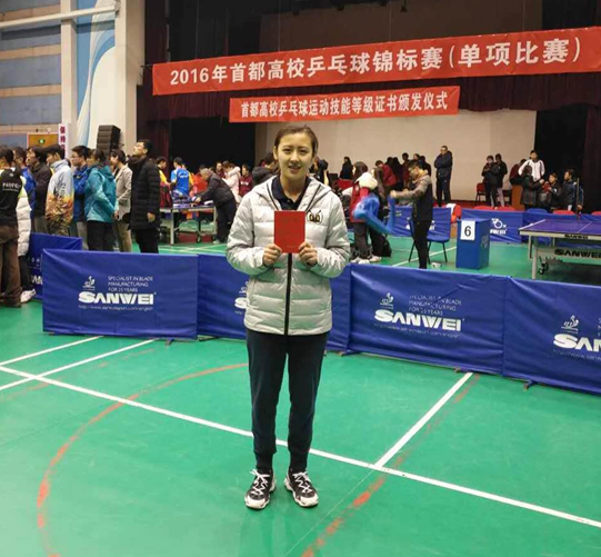 12月3-4日,在北方工业大学体育馆举办的2016年首都高校乒乓球锦标赛中,我院选手任丛菁勇夺甲B组(非特招普通学生最高级别组)女子单打季军。