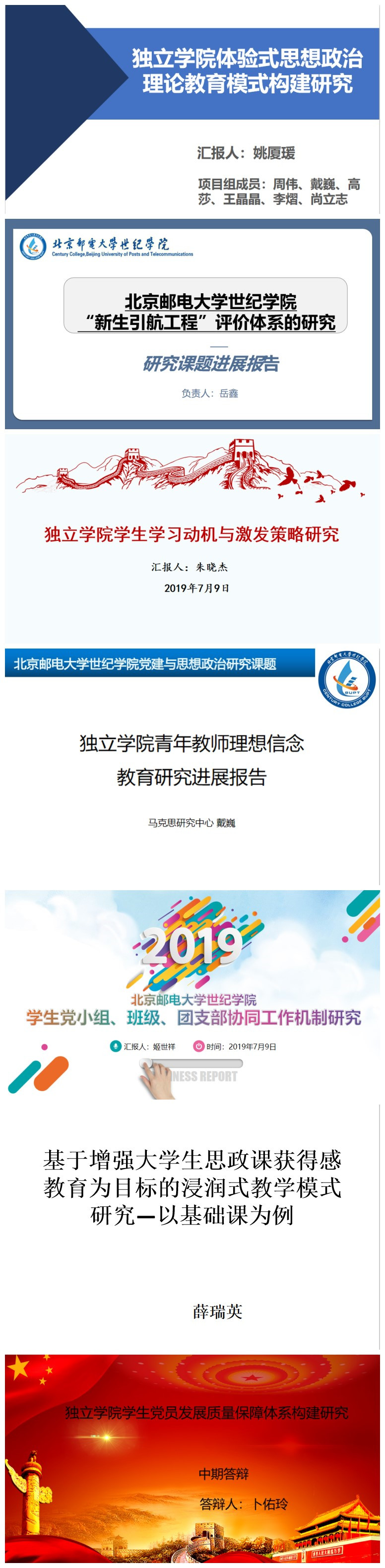 7月9日上午,学院2018-2019年度党建思政研究课题中期答辩会在明德楼604会议室举行。学院党委书记谢苗峰出席答辩,北邮经济管理学院教授许叶萍、学院党委委员综合办主任周伟、学院马研中心戴巍担任评审,北邮马克思主义学院院长周晔、学院学生处处长张秀芬任网络评审。