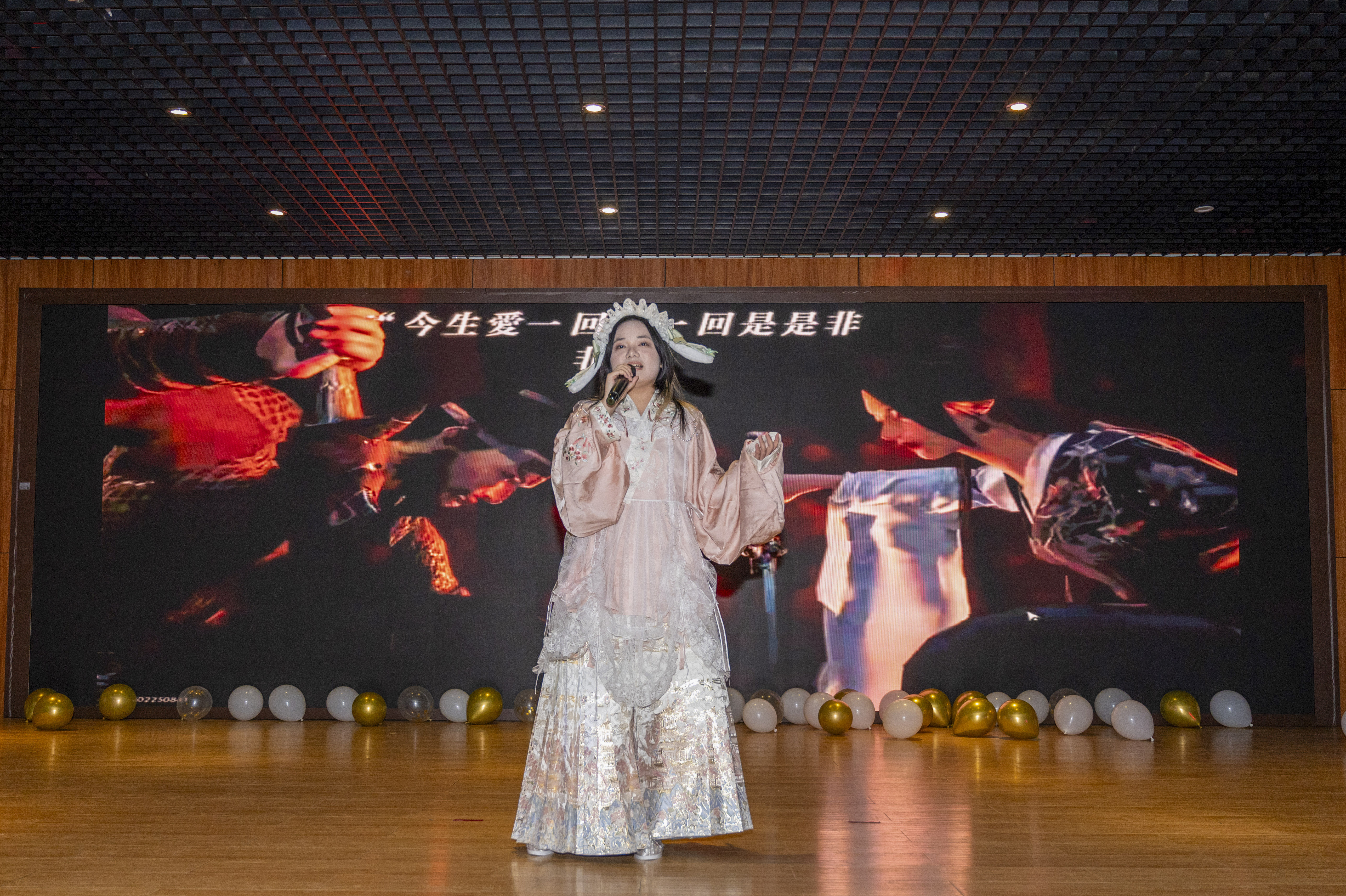 音乐会序幕,由艺术与传媒学院陈敏文、戴嘉岳等人的歌曲串烧掀起全场热情——《来自天堂的魔鬼》的甜酷张力撞上《最炫民族风》的洗脑节奏,极具反差感的表演甫一落幕,观众们的手臂便随着音乐一起挥舞,冬夜的冷意瞬间被现场热度驱散。紧接着,不同底色的旋律轮番登场:《淘汰》《嘉宾》以细腻声线裹着遗憾情绪,引发观众共鸣;《至少还有你》的温柔唱腔将寒夜变得柔软;《梦幻诛仙》的空灵意境,上演了一场仙侠江湖;《逝年》《董小姐》《斑马》用松弛的民谣节奏,把青春故事娓娓道来;《匆匆那年》《背对背拥抱》一开口便勾动共同的青春记忆,现场响起轻浅的合唱;《不将就》《倒数》里的高音掀动全场欢呼;《天亮了》的深情翻唱藏着催泪力量,让室内的空气都静了几分。最后,大学生艺术团合唱团以整齐和声压轴,悠扬的旋律把整场音乐会的温暖氛围推向顶点。