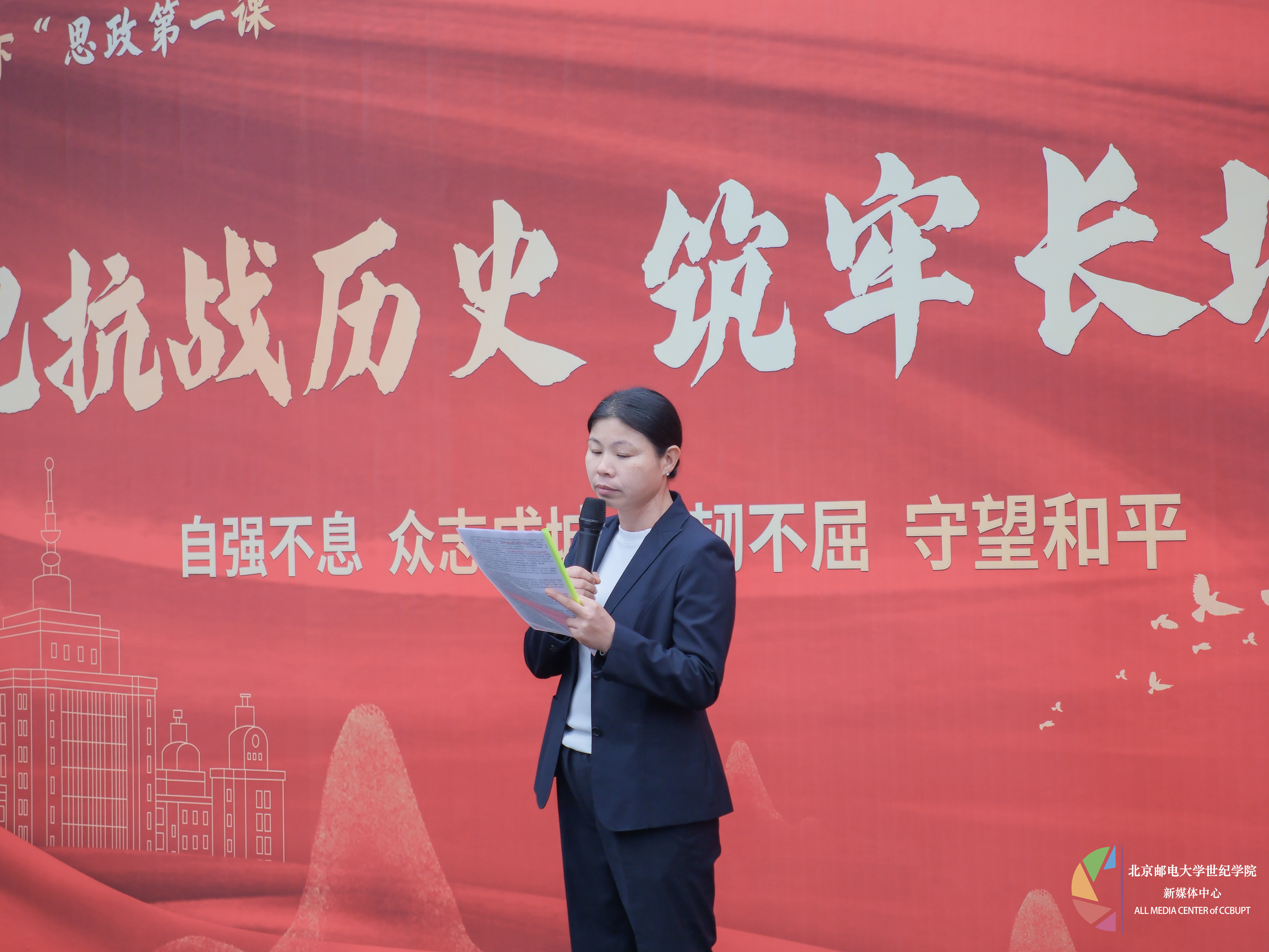 基础教学部教师薛瑞英以熠熠生辉的抗战精神为指引,深情回望那段烽火岁月,带领现场师生重温先辈们浴血奋战的壮举,她以铿锵有力的号召点燃青年学子的家国情怀,呼吁学生做历史记忆的守护者、发展振兴的同行者、国际公平正义的捍卫者。