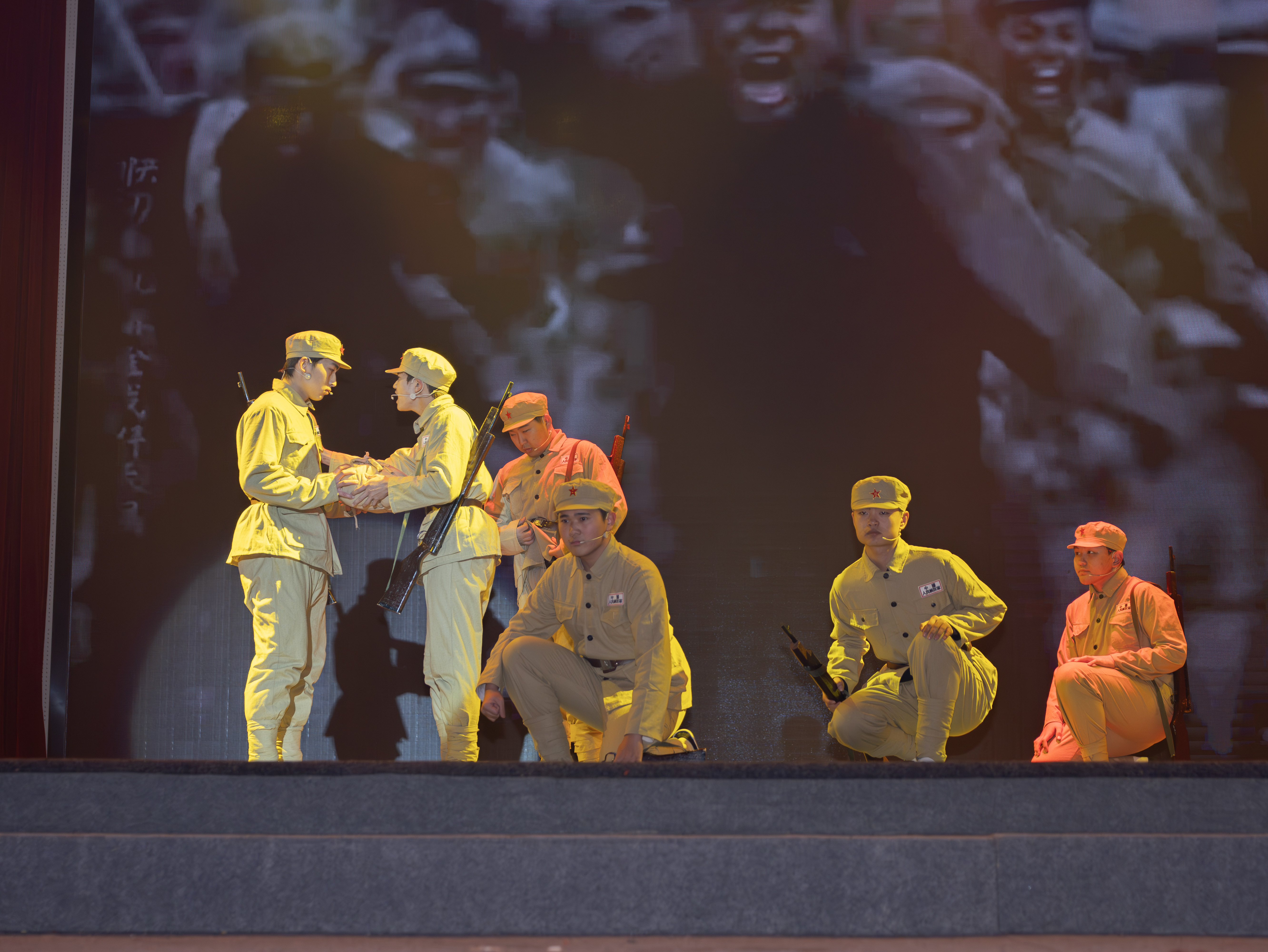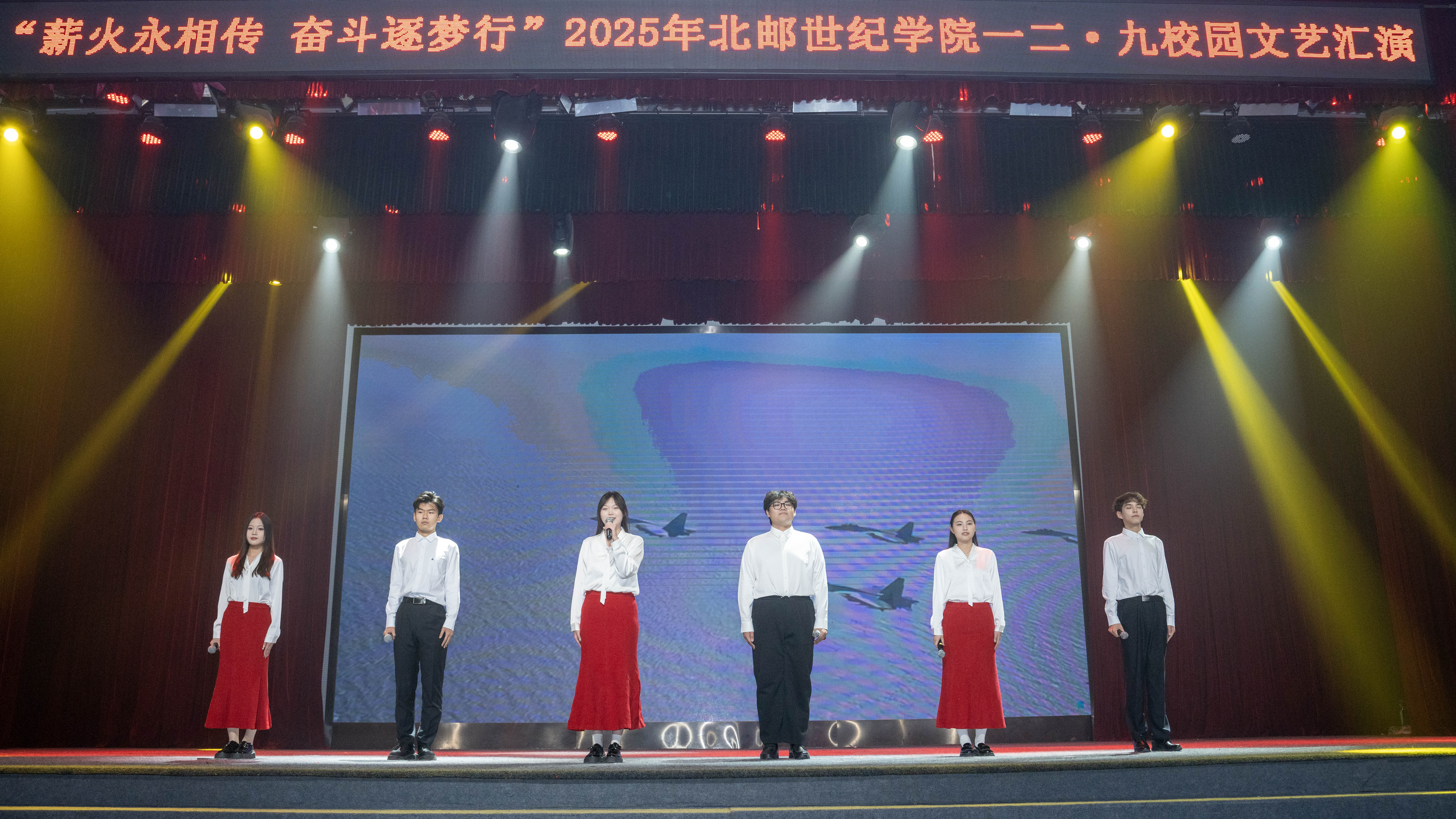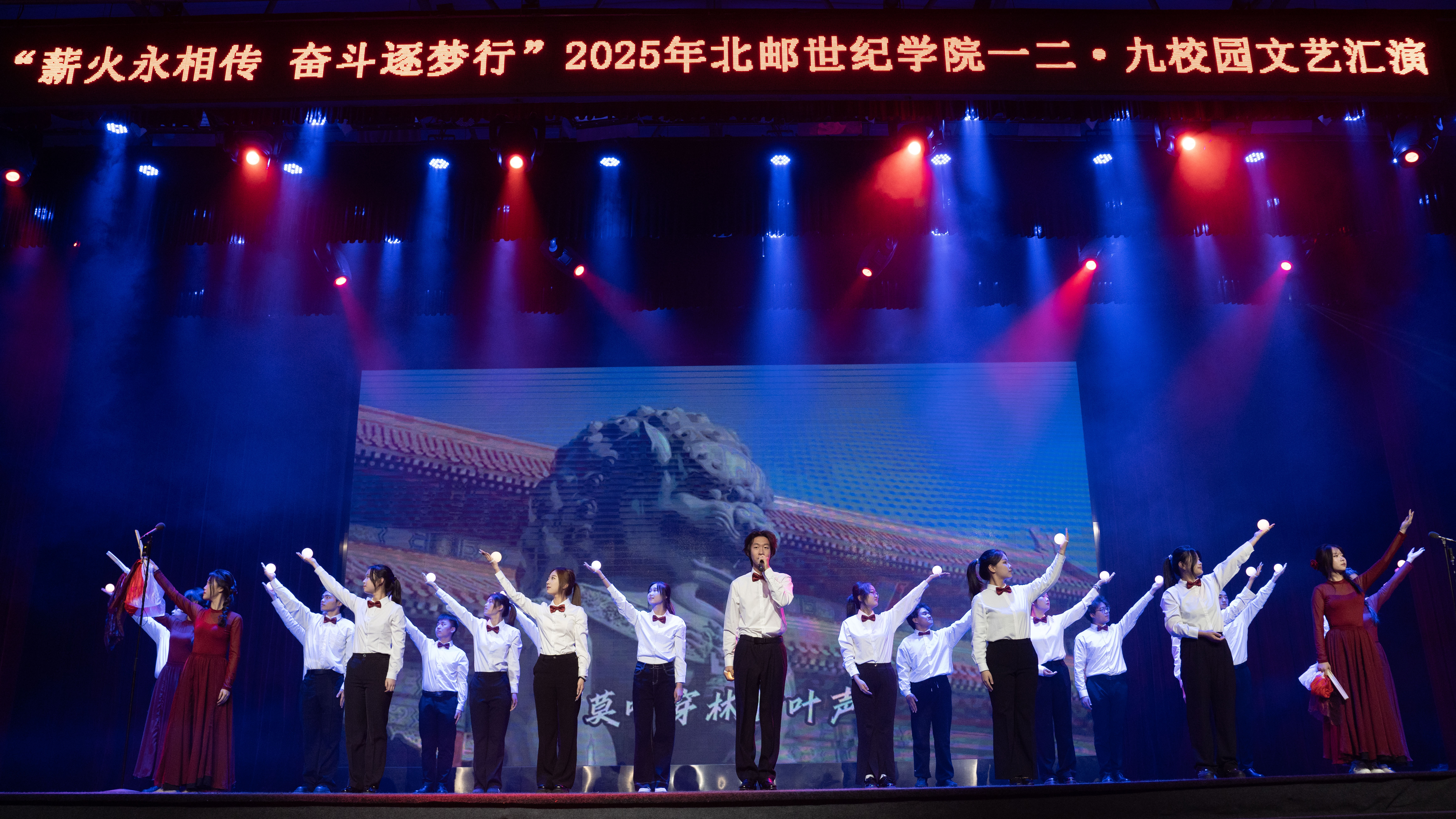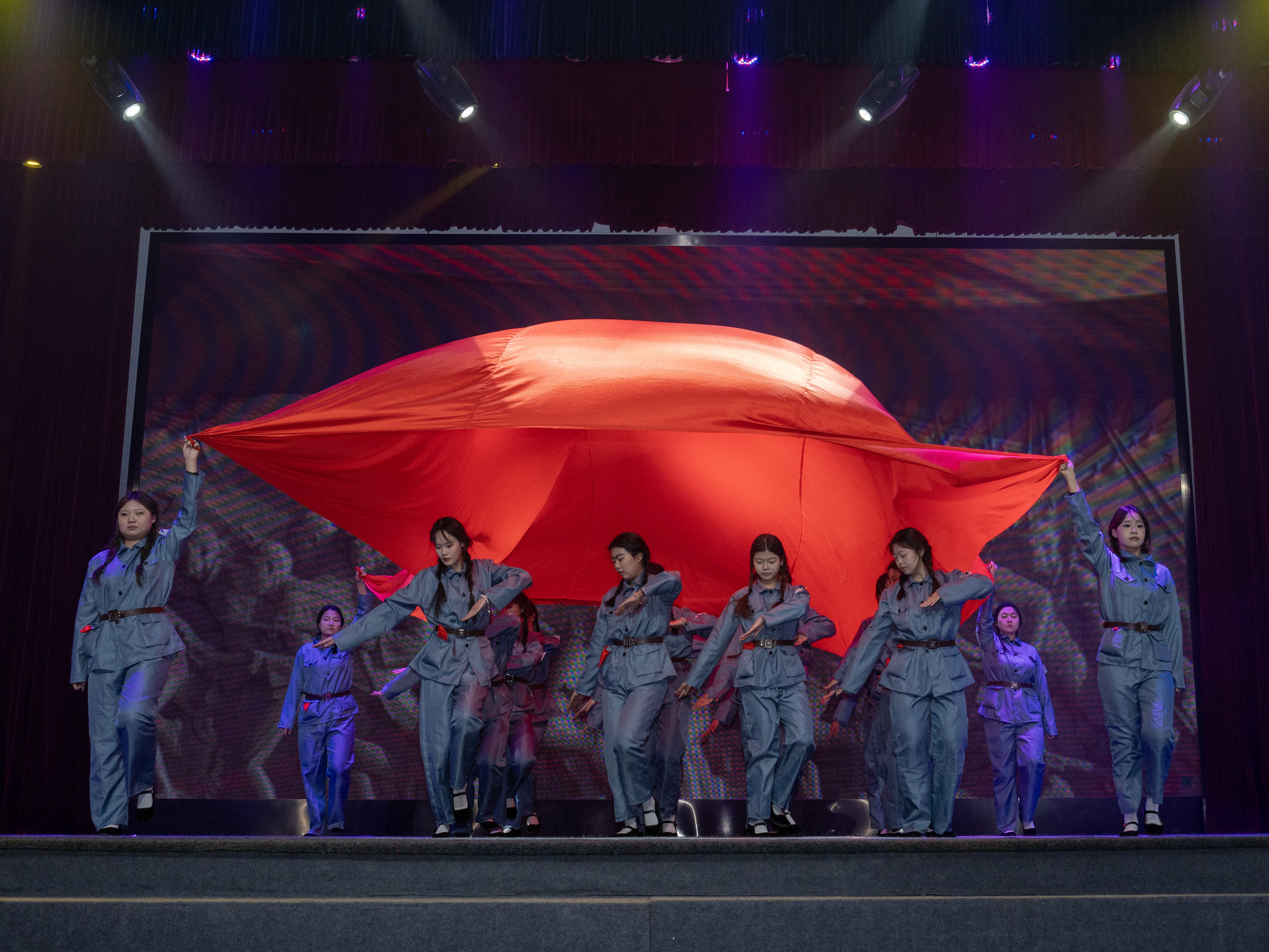 第一篇章“薪火永相传” 聚焦红色传承。通信与信息工程系歌曲《光亮》拉开演出序幕,嘹亮歌声点燃全场热情;艺术与传媒学院诗朗诵《破晓之光》,复刻当年学子救亡图存的呐喊;通信与信息工程系情景剧《跨越时空的青春对白》搭建起当代青年与革命先辈的精神桥梁;经济管理系舞蹈《我心中的红》、艺术团诵演团话剧《这束光 万束光》等节目,从不同维度诠释爱国情怀,让红色基因融入青春血脉。