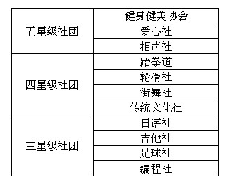 经各社团申报,社团联合会实施核定及学院团委复核,北京邮电大学世纪学院2013-2014学年星级社团评比工作已经结束,评比五星社团3个,四星社团4个,三星社团4个,共11个社团。现将评比结果予以公示。