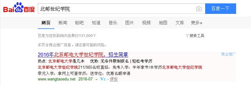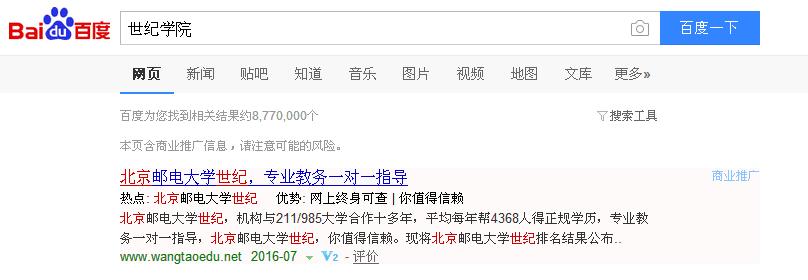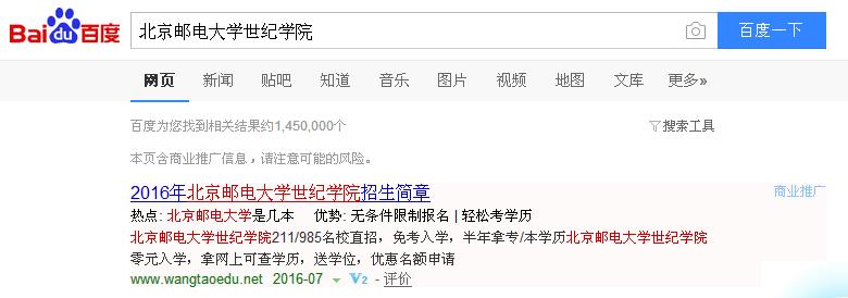 近日,广大学生家长及关心我院发展的社会各界朋友致电反映:在百度搜索栏输入“北京邮电大学世纪学院”、“北邮世纪学院”、“世纪学院”关键词时,发现弹出的首条信息为某成人招考网站的商业推广信息,如下图搜索截屏所示: