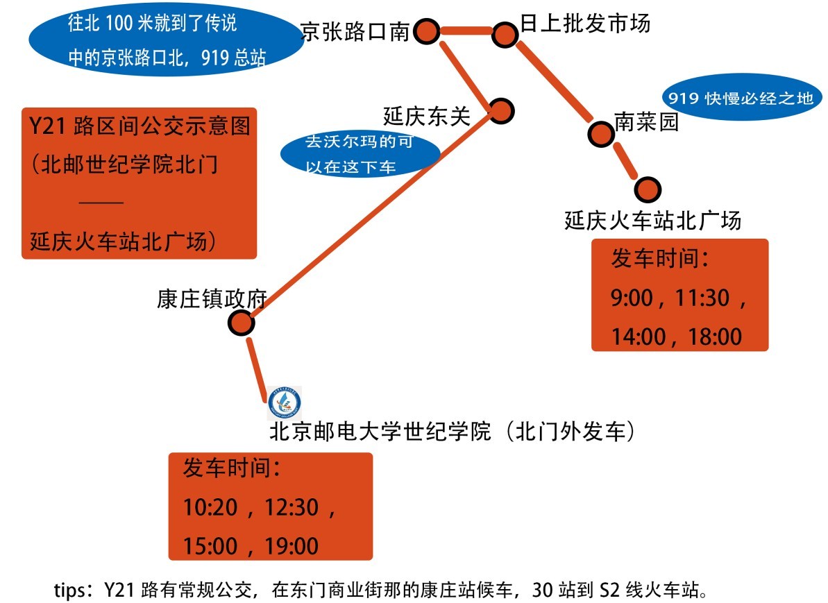 经协调,在延庆区交通局和八方达延庆分公司的大力支持下,学院至延庆火车站的Y21路区间公交(大站快车)将于2016年2月27日(周六)通车(试运行),现将相关事项说明如下: