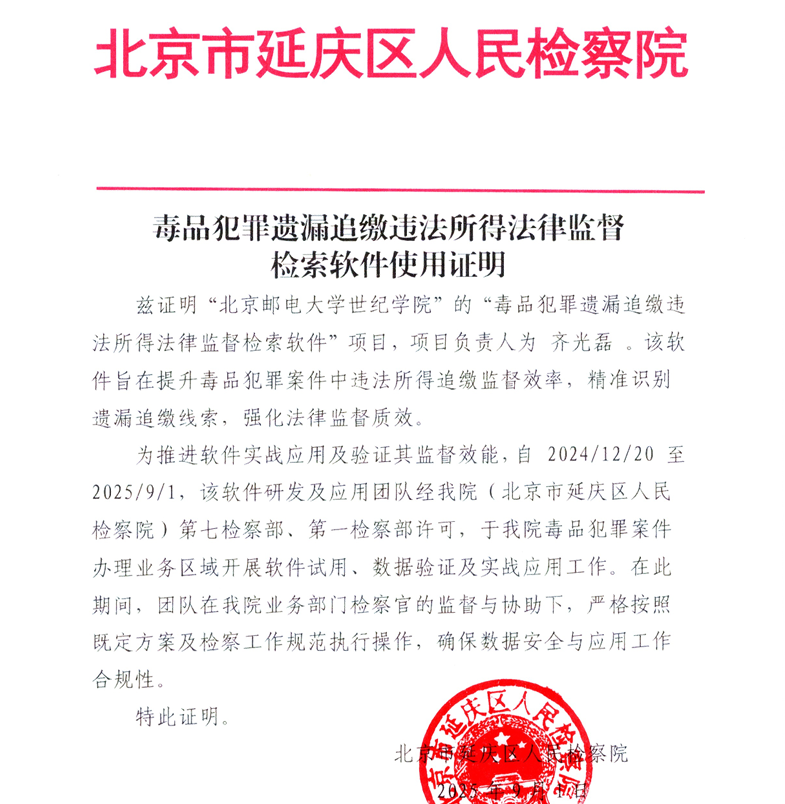 在深化党建与科研融合、拓展校企(检)合作的实践中,学院计算机科学与技术系教工党支部充分发挥专业优势,联合地方检察院协同攻关,牵头研发的“大数据赋能刑事审判监督”成果——“毒品犯罪遗漏追缴违法所得法律监督检索软件”项目,获评北京市检察机关数字检察典型案例,入选最高检大数据法律监督模型平台,在全国检察机关推广应用,为法治建设注入智能高效的“红色动能”,彰显了党建引领下校检合作的坚实成效与深远价值。