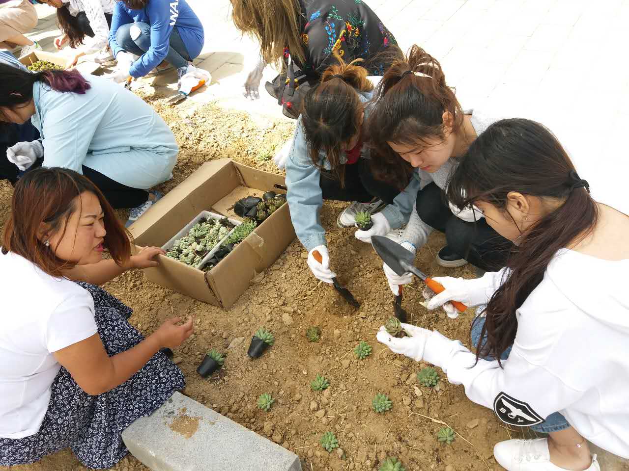 到达文体中心后,在种植老师的亲自指导下,志愿者们迅速投入到工作中,挖坑、栽种、填土……大家分工明确,密切配合,认真细致的完成每一株植物的种植。在志愿者们的辛勤劳作下,空地上种满了整齐、精神的多肉植物。