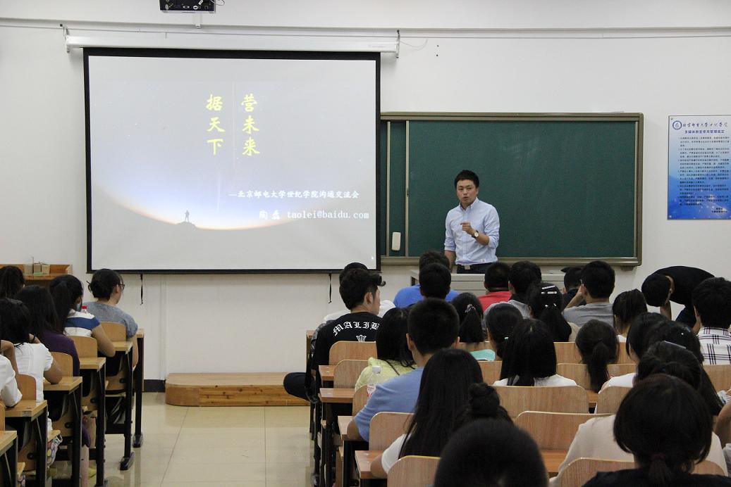 2014年8月19日15:30,名为“据天下,营未来”的大数据主题讲座于学思楼103教室准时开启。为给予2014级经济管理系新生更好的职业前景规划教育,我系特邀请来自百度的营销大学高级讲师陶磊先生前来主讲。经管系副主任师蕾,辅导员陈艳、樊洋、童慧娟与全体新生一同聆听了讲座。