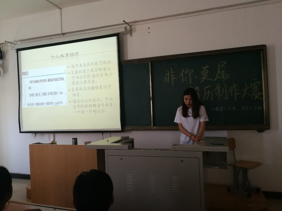 为了引导通信系2014级学生赢在求职的起跑线上,并在竞争激烈的求职路上脱颖而出,5月18日通信系举行了以“非你莫属”为主题的简历制作大赛,有14名同学们进入最后的简历展示环节。