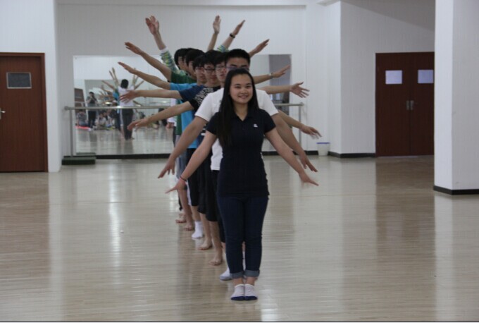 活动分为“动作传递”“即兴舞动”“舞蹈展示”三个环节。“动作传递”有两个阶段,第一阶段每位参与者轮流展示自己的肢体动作,其余参与者一同模仿互动;第二阶段每位参与者借助丝巾,轮流用舞蹈介绍自己。这个环节消除了参与者间的尴尬气氛,让他们从最开始的拘束状态逐渐放松自己,融入活动中。接着进入“即兴舞动”环节,两人一组,参与者们先用一些简单的动作和伙伴打招呼,之后进行角色设定。其中一人随着音乐即兴舞动,而另一位参与者跟随他进行模仿舞动。在舞动的过程中,有些小组进行的很顺利,而有些小组的动作却总是不一致,难以达到要求,因为他们不知道该如何进行舞动,这个环节很好地向参与者们传达“一个领导者带领他人需要的自身条件。领导者在执行的过程中需要有自己的想法并且懂得换位思考,能准确地下达任务,让团队的成员有一个清晰的方向去执行任务,从而高效率地完成任务”。在“舞蹈展示”环节中,老师将所有参与者分成三个小团队,根据团队的心情编排舞蹈,表达团队情感,第一组团队用真诚的表演展现了人际交往过程中陌生到熟悉的四个阶段;第二组团队用默契的表演展现了团队个性与合作的重要性;第三组团队用欢快的舞步展现了人们交流沟通过程中分享的意义所在。