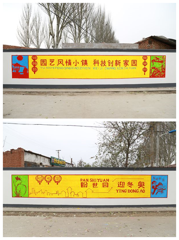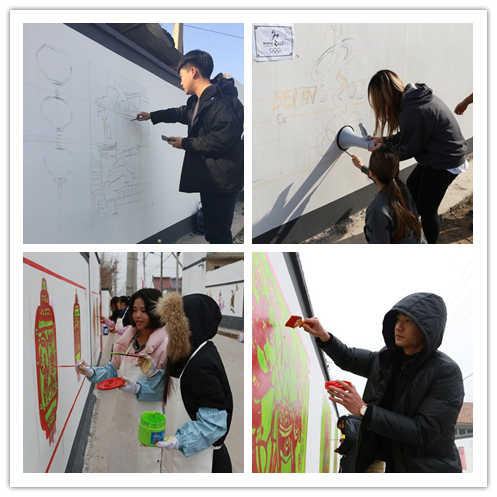 绘制现场,专业教师对学生们进行精心指导并参与创作绘制。经过师生的共同努力,6日中午绘制工作提前完成。百米长的墙体焕然一新,彰显着吉祥和美的街道墙壁,展现了北曹营村秀美的人文风光、和谐的生活氛围,处处散发着美好乡村的独特魅力。北曹营村党支部书记、村主任曹艳勇进行了工程验收,他动情的说:“感谢北京邮电大学世纪学院的师生们在寒冷冬日的辛勤付出,祝福同学们在未来的艺术之路上越走越宽!”