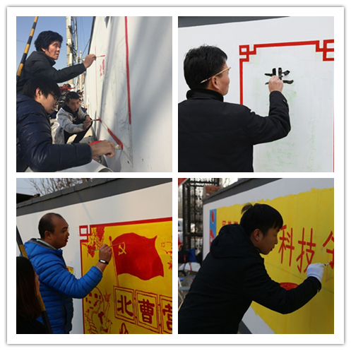 传媒学院将此次活动作为开展“两学一做”学习教育与学生社会实践的一项重要内容,教工、学生党支部联合动员专业教师和学生广泛参与。经过前期双方的多次沟通与商讨,在开展墙体绘制的调研准备、实地的墙体数据勘测和学生动员工作的基础上,传媒学院师生代表百余人于11月5-6日,前往北曹营村实地进行文化长廊工程绘制工作。