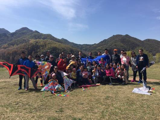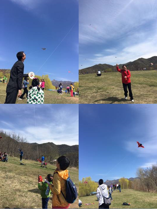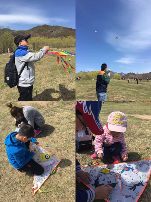 很快,欢快的笑声、追逐的身影、扶摇的风筝,打破了山间的沉静,增添了不少动感和春色。蝴蝶、金鱼、老鹰、燕子……各式各样、五颜六色的风筝在欢声笑语中你追我赶地飞上了天。放风筝的各位“选手”可一点也不轻松,个个紧握风筝线,有的生怕一个不小心,风筝落在他人之下;有的忘了放线,风筝打着旋一猛子扎下来,引发一阵哀叹,掉落树上的更令人捶胸顿足;有的没控制好,自己的风筝和别人的风筝搅合在一起,又是收线又是清理,一通忙乱;有的现场动手,DIY涂色,致力于描绘制作独一无二的风筝……歌声、笑声、感叹声混成一片……