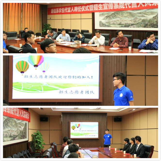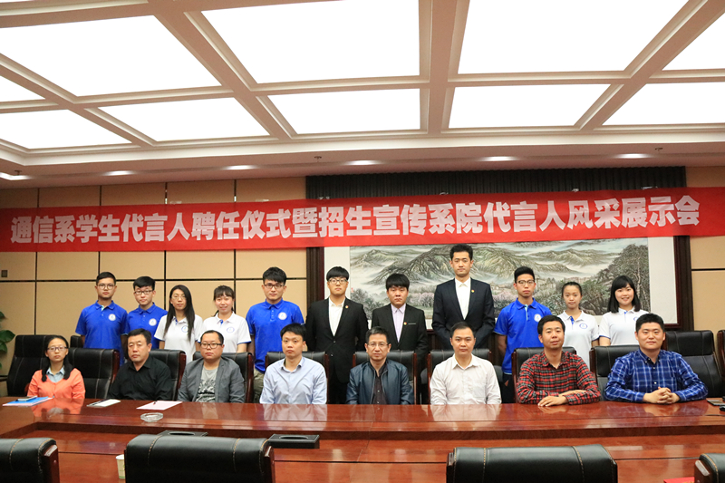 5月10日,通信与信息工程系联合学院招就处,举行通信系学生代言人聘任仪式暨风采展示会。学院招就处处长宋向阳、副处长王帅,通信系副主任沙招友及相关教师,招生志愿者团队学生代表参加了本次活动。