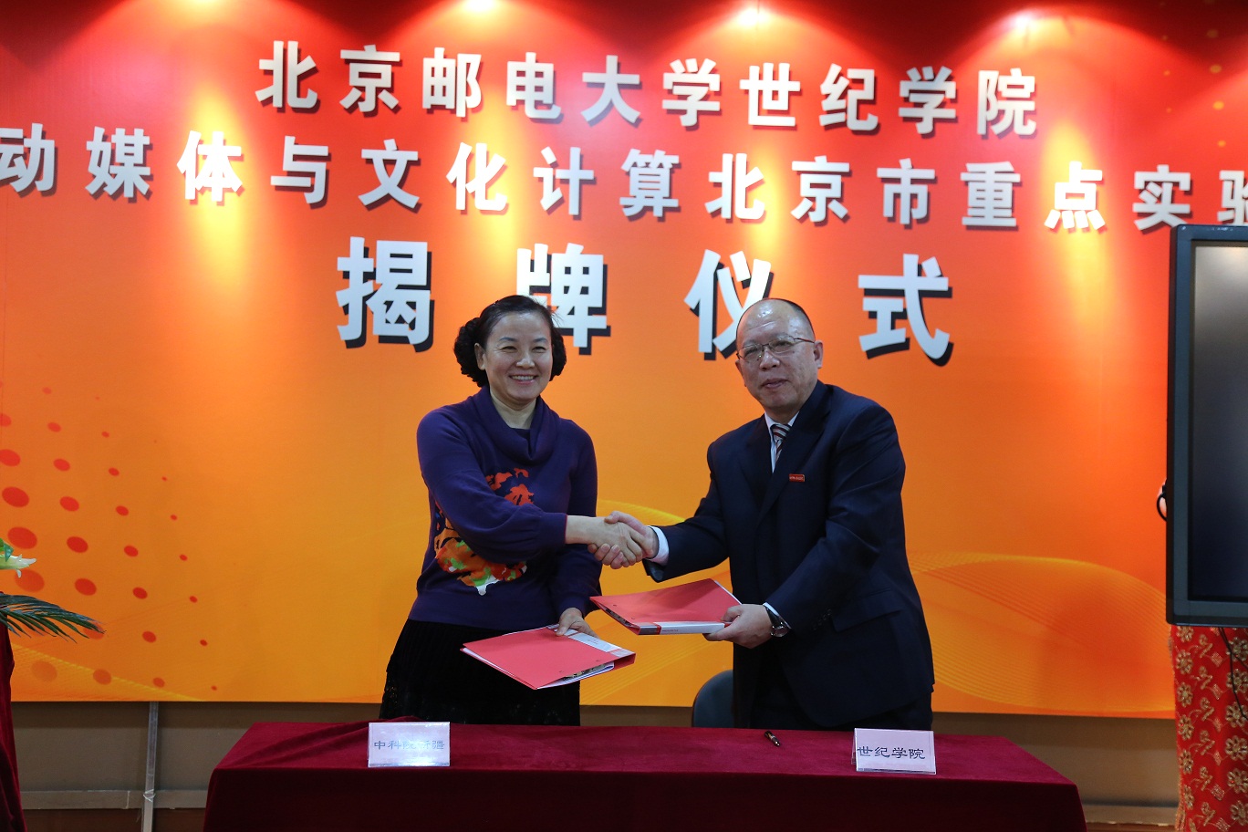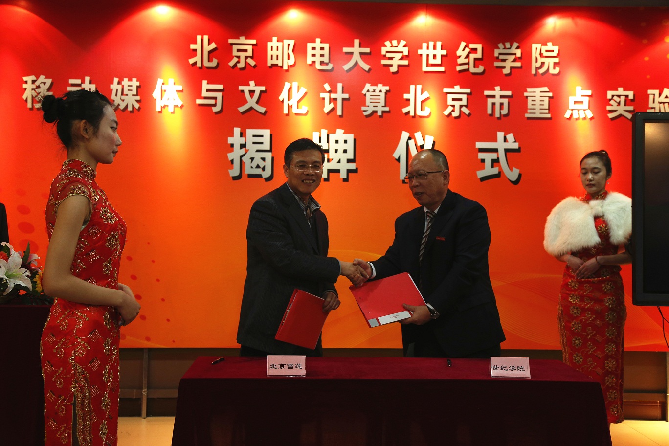 北京邮电大学世纪学院移动媒体与文化计算北京市重点实验室揭牌仪式于2014年12月30日在北邮世纪学院举行。北京市人大常委会教科文卫体委员会副主任委员颜振军,北京市科委副处长董齐超,浙江大学教授彭群生等全国15位资深教授,北京邮电大学副校长、世纪学院院长李杰等领导出席仪式。颜振军副主任与李杰院长共同为北京市重点实验室揭牌。